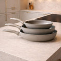 Det afhænger af overflader og materiale på både redskaber og kogegrej. Hvis du vil være på den sikre side, kan du matche redskaberne til den type gryder og pander, du bruger mest.