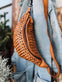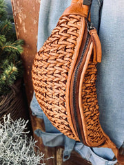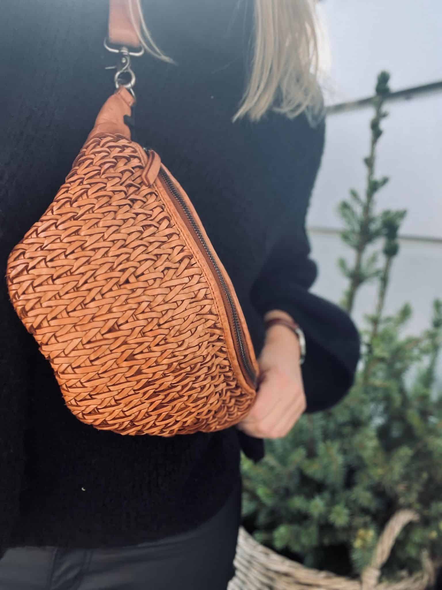 Tasken har et smukt og eksklusivt look, da den er pyntet med den fineste fletning på hele fronten. Den lukkes i toppen med lynlås.