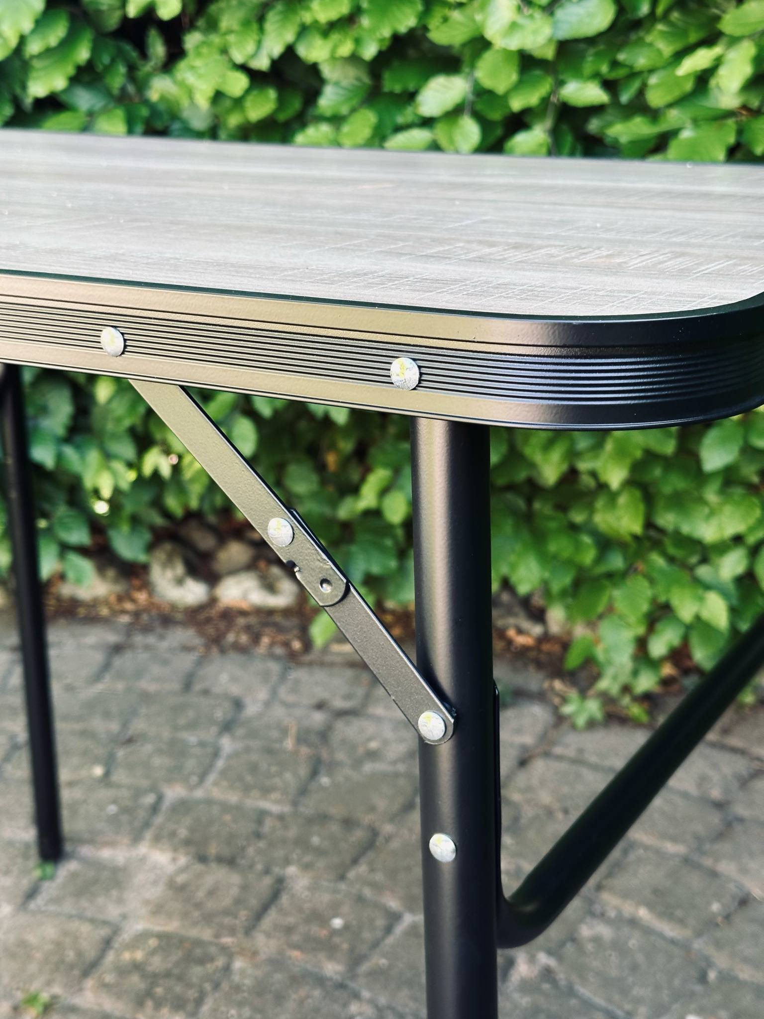 Bordbenene kan skrues af og sættes under pladen, bordet kan løftes i håndtaget der sidder på siden af bordet.