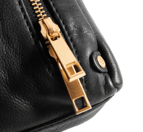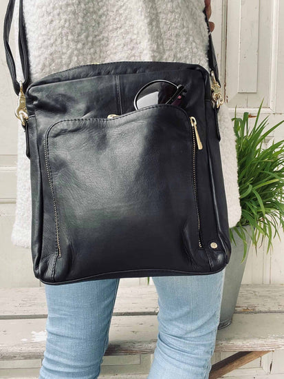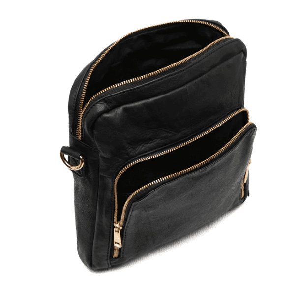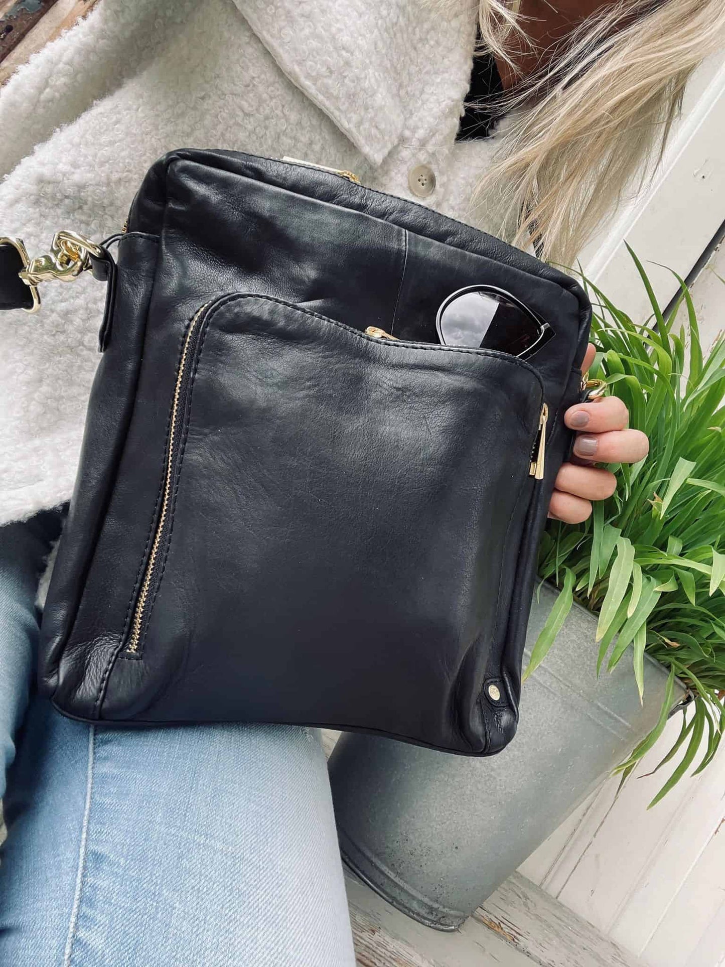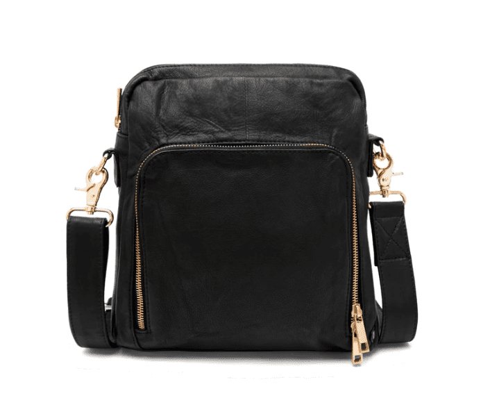 Crossbody taske i silkeblød og lækker skindkvalitet. Tasken har et simpelt look, men er dekoreret med guldfarvet hardware og en stor lynlås lomme på fronten.