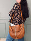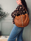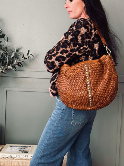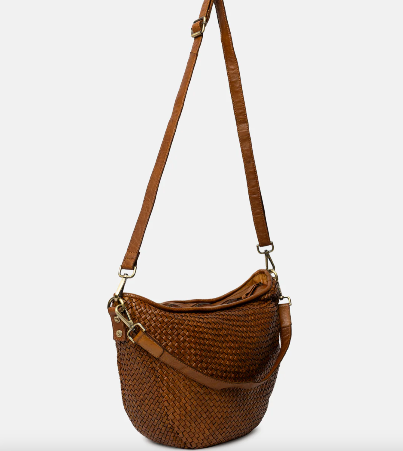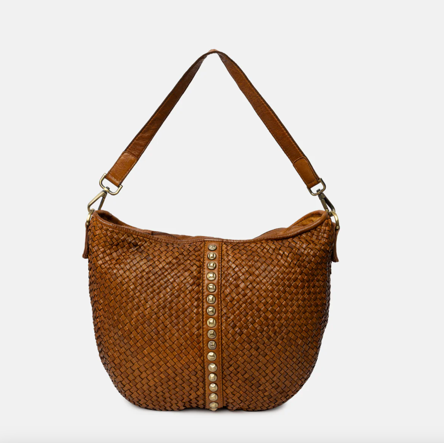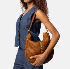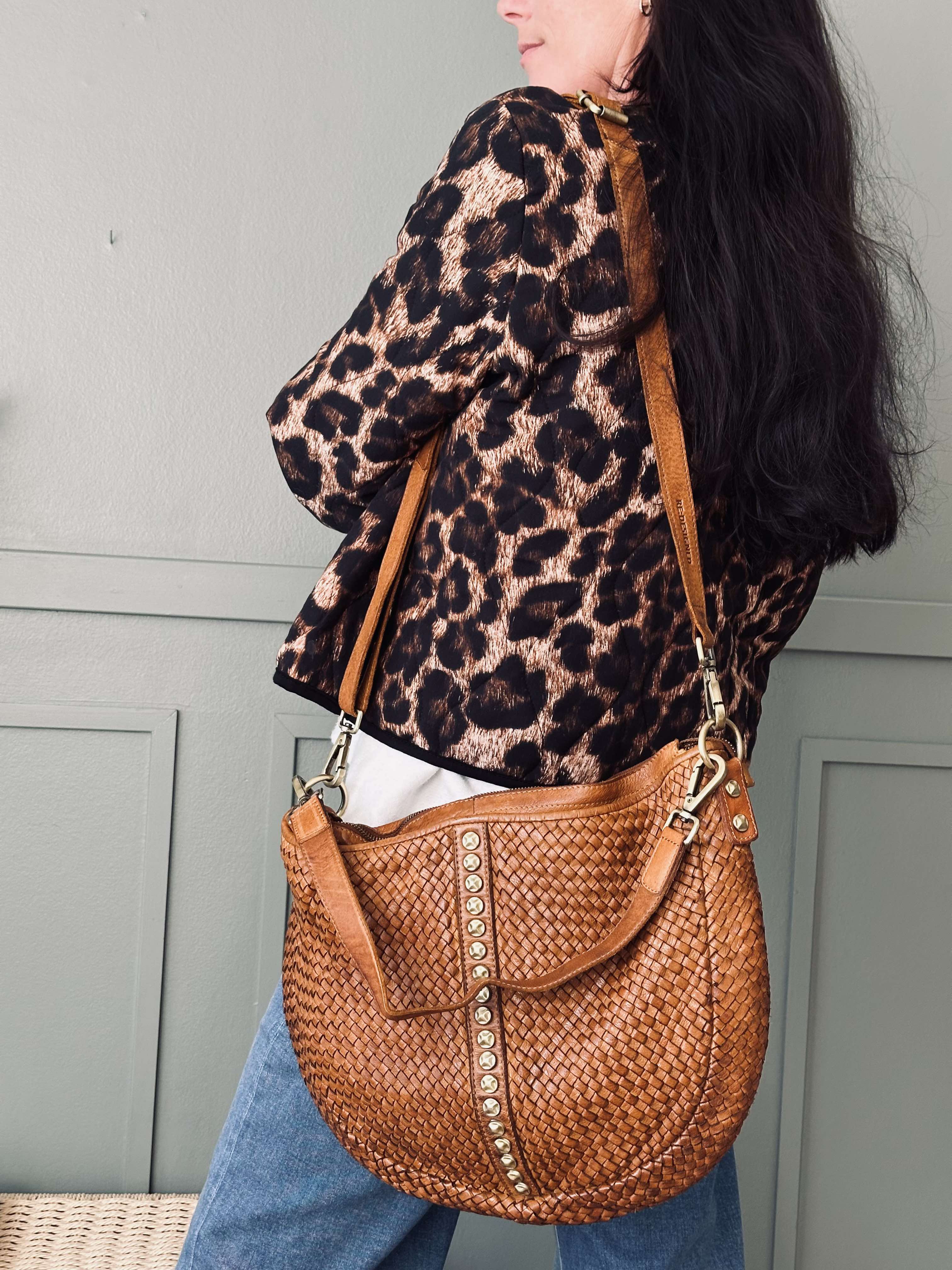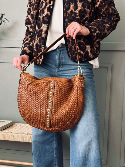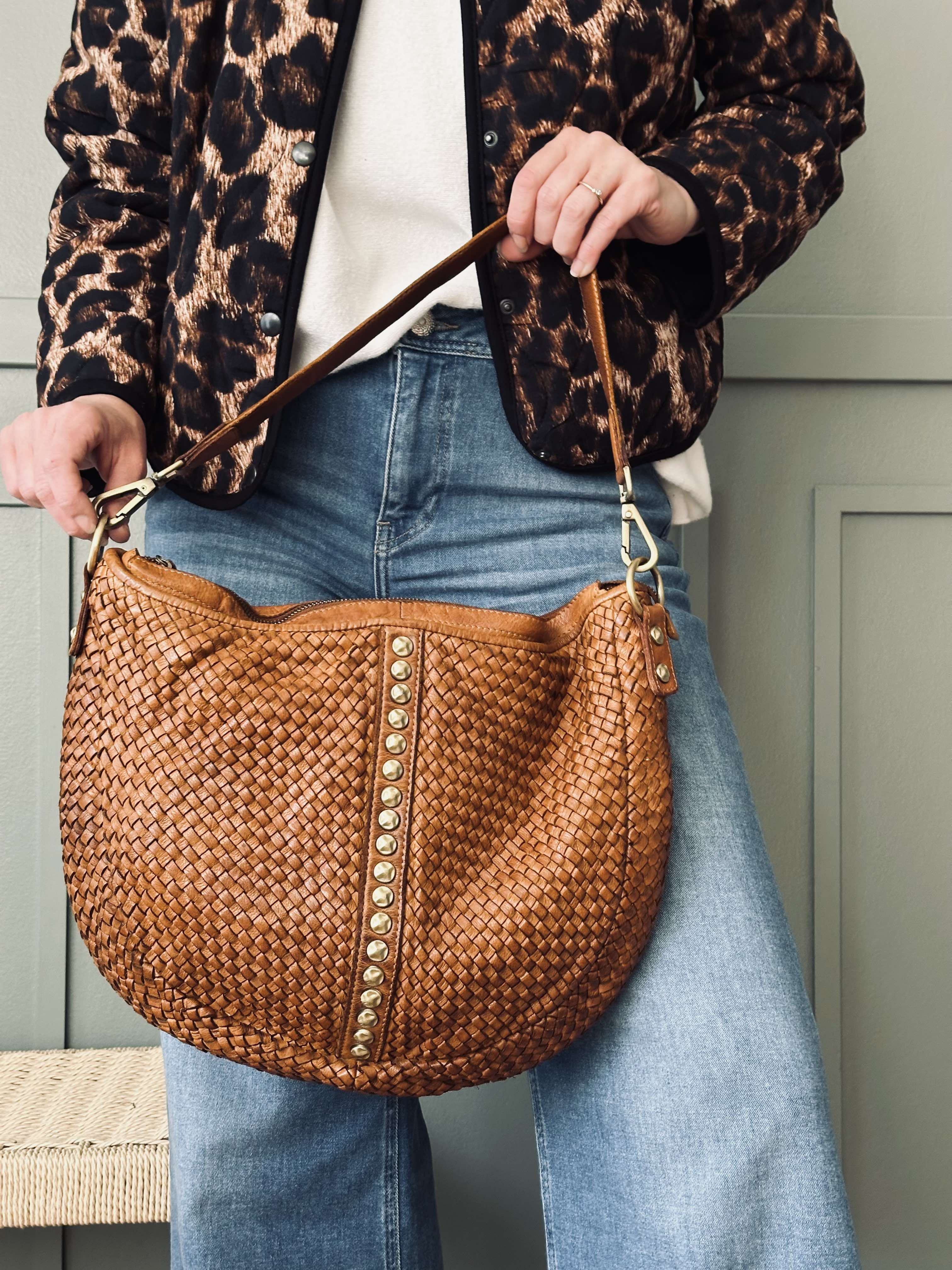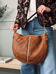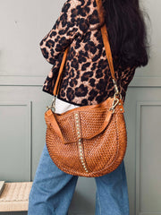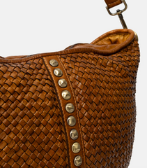 Denne lækre taske viser et elegant flettet design hele vejen igennem, suppleret med små guldknapper i midten af fronten. Den leveres med både en justerbar rem og en mindre skulderrem for alsidige bæremuligheder.