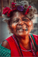 - Motiv: kvinde med høj cigar og blomster i håret