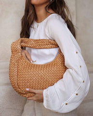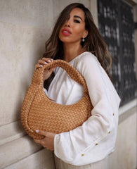 Den rundede form på tasken giver den et trendy og tidløst look, der gør den velegnet til mange forskellige anledninger. Den flettede rem tilføjer et ekstra sofistikeret touch, som gør tasken både stilfuld og unik.