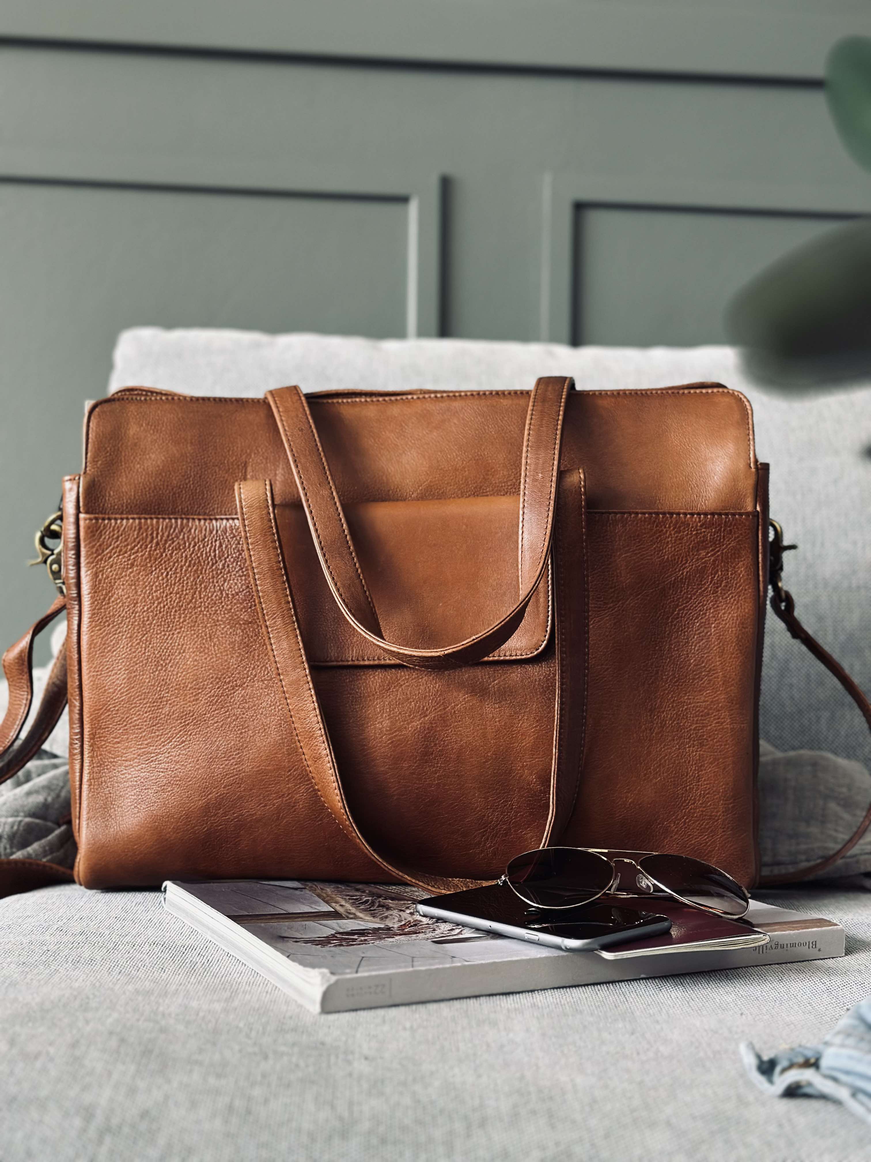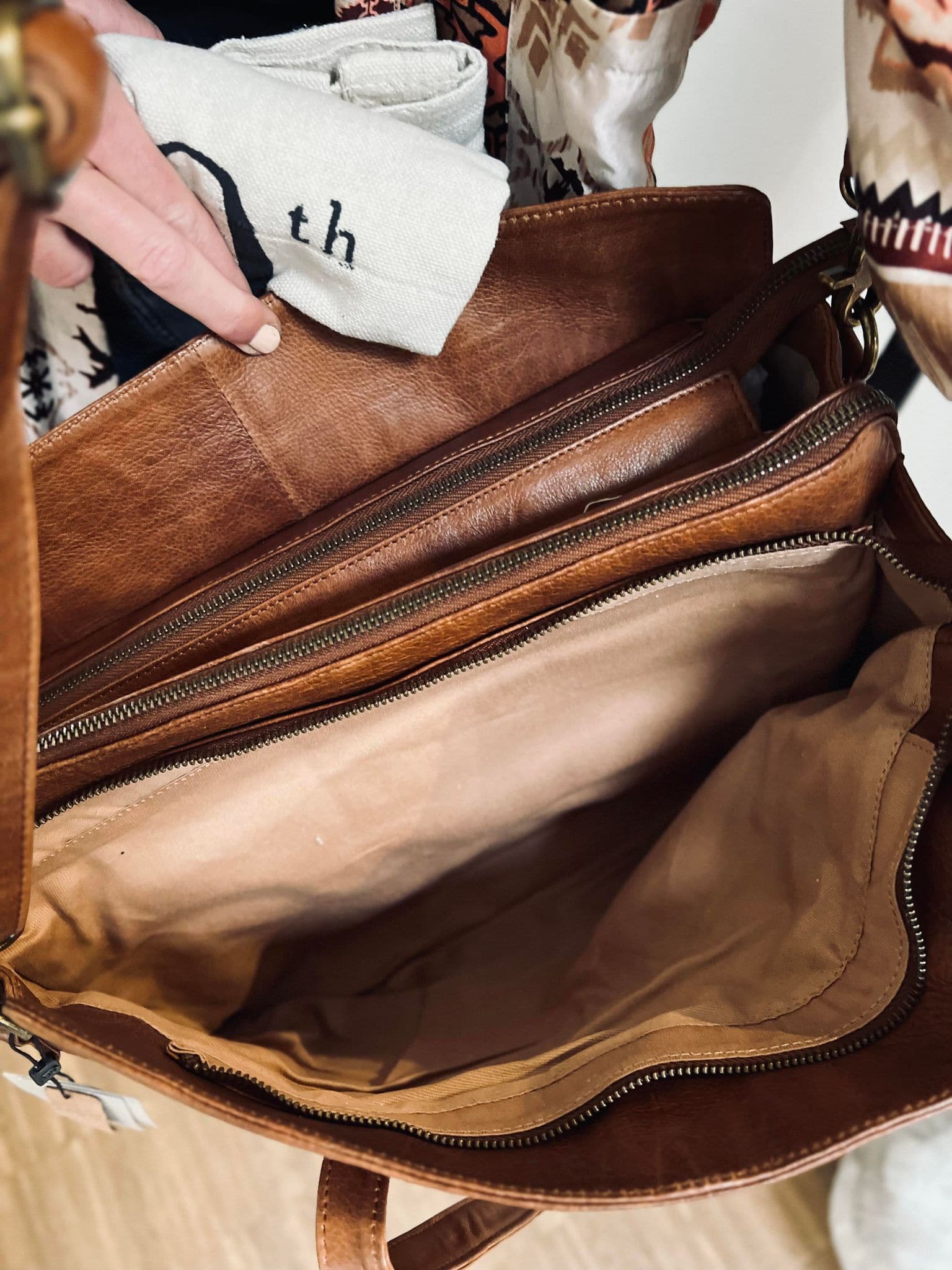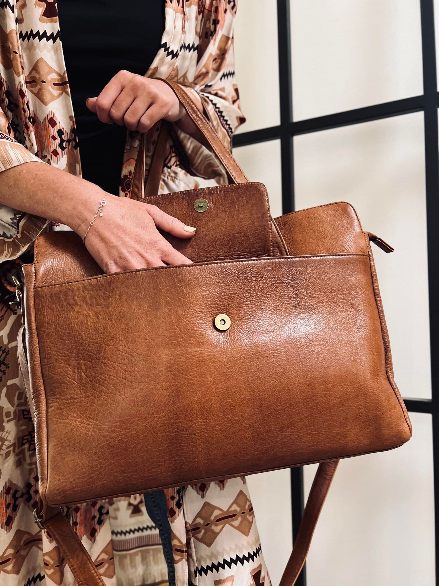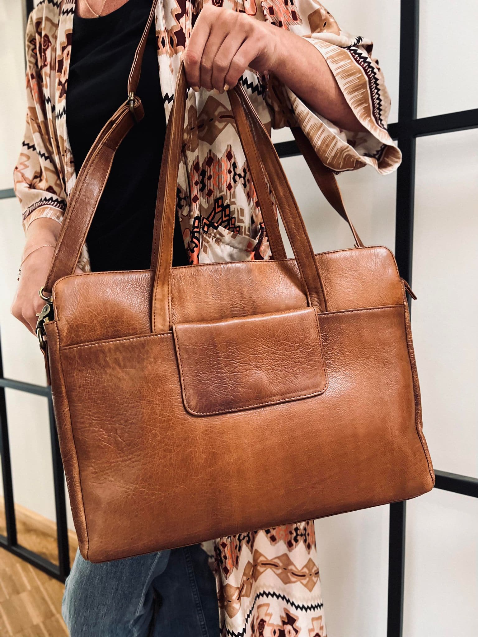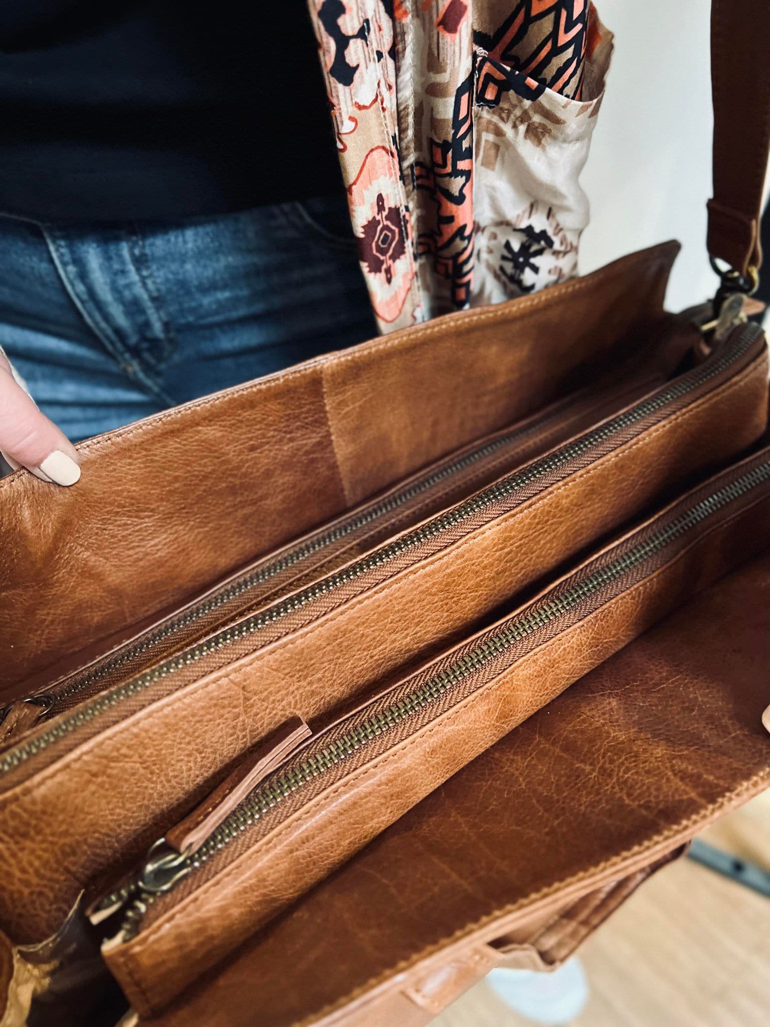Tasken har tre hovedrum, der lukkes med metallynlåse. Inde i et af rummene finder du en mindre lynlåslomme i foret. Foran på tasken finder du en lomme, som lukkes med læderklap og magnetknap.