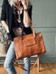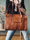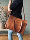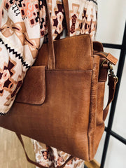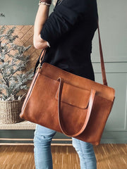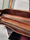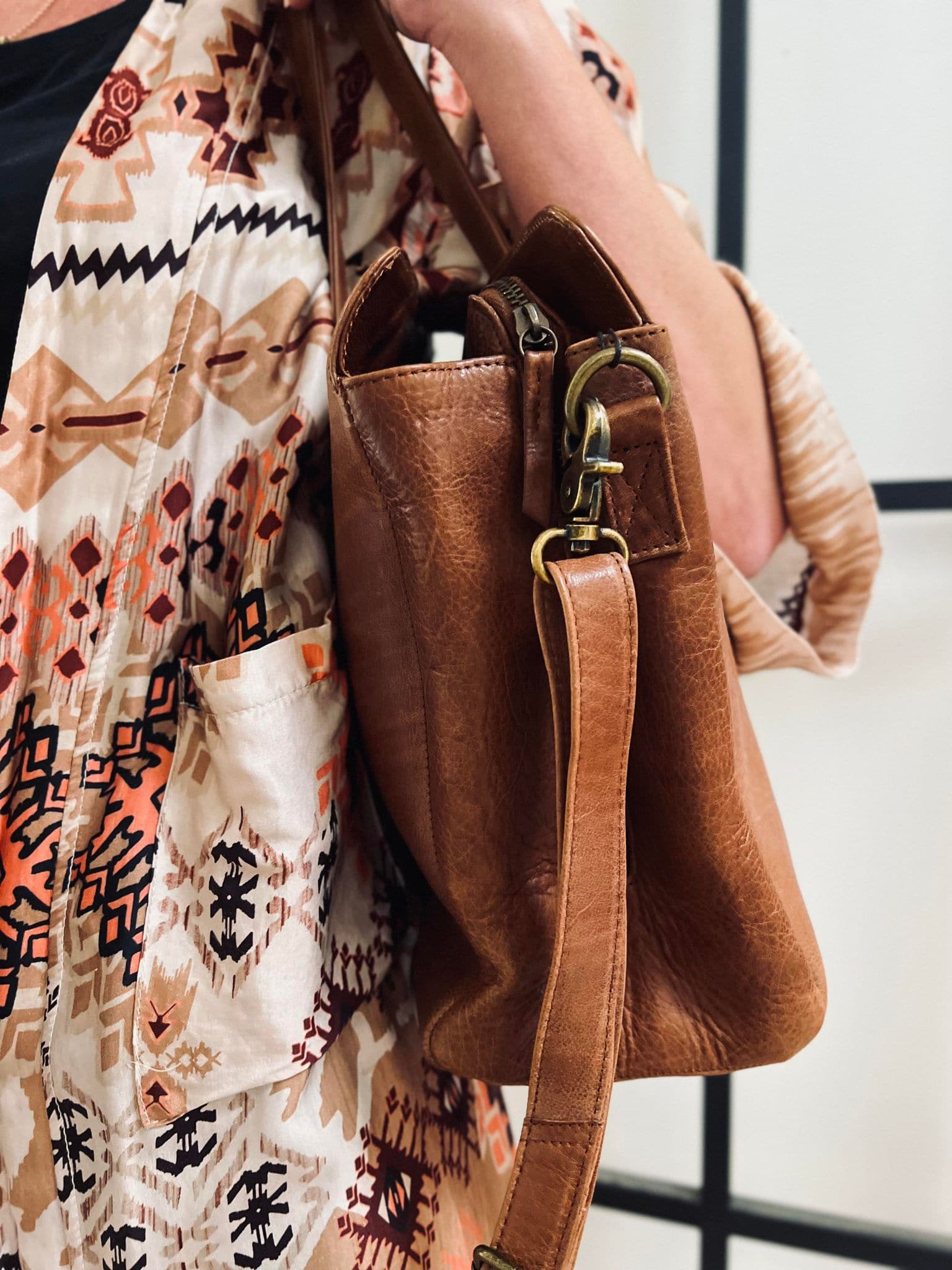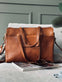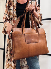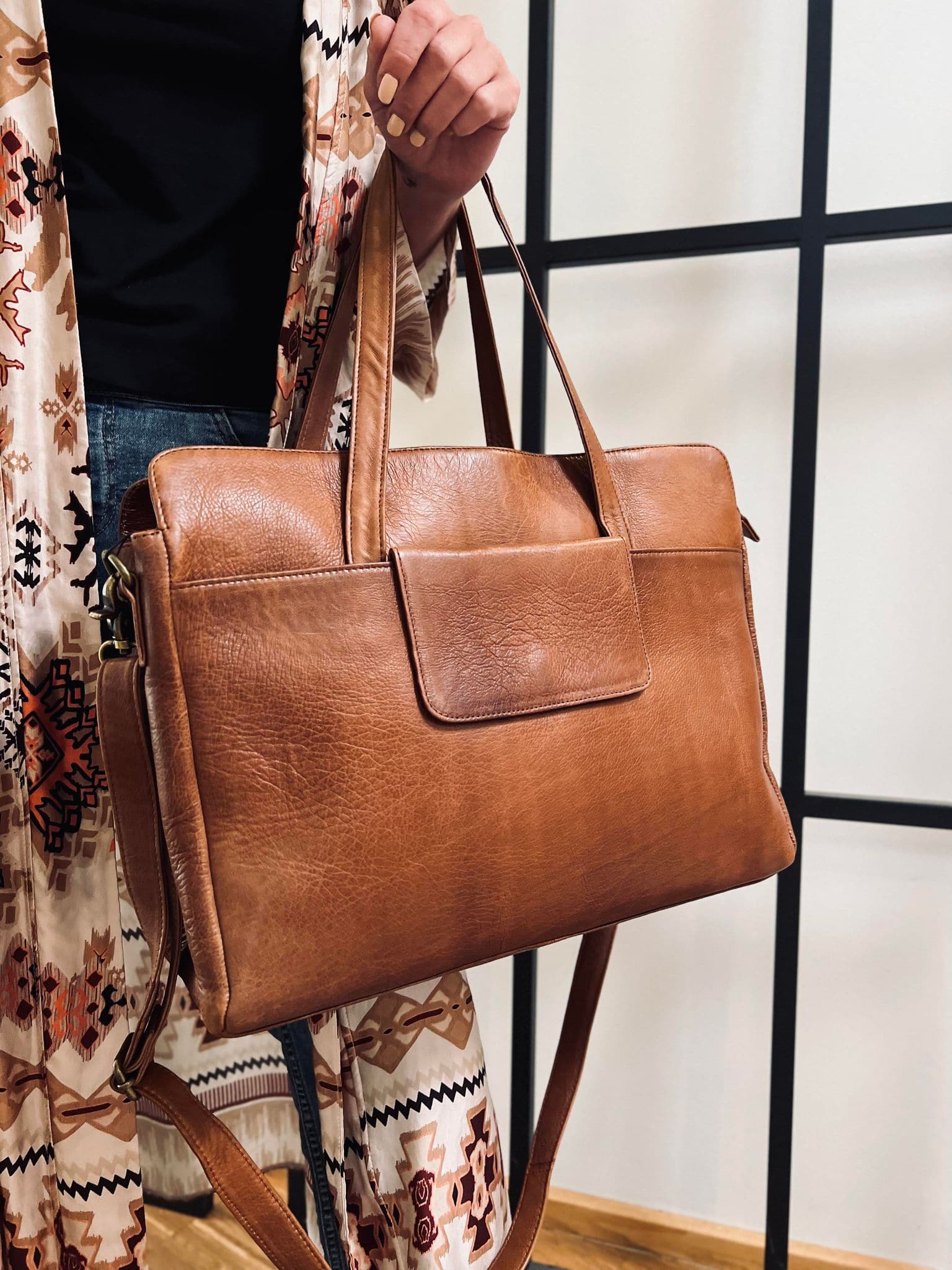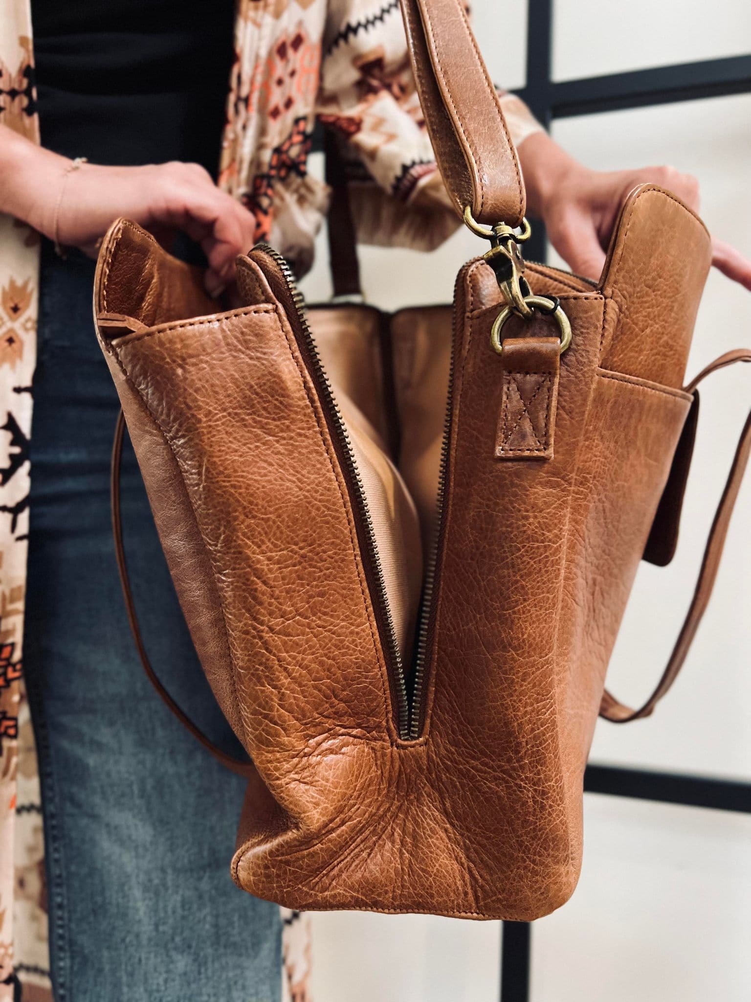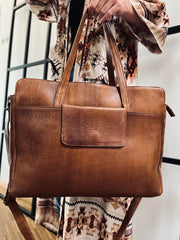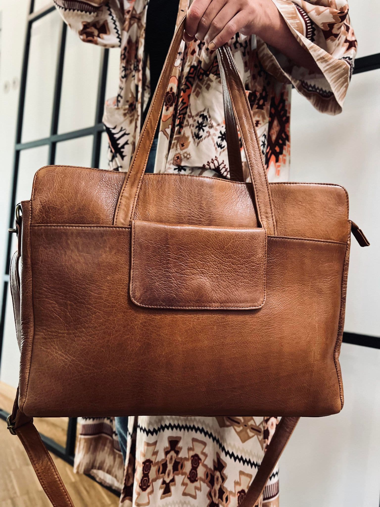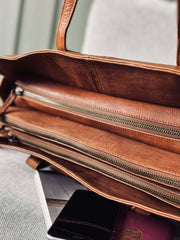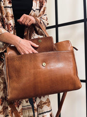 Tasken har tre hovedrum, der lukkes med metallynlåse. Inde i et af rummene finder du en mindre lynlåslomme i foret. Foran på tasken finder du en lomme, som lukkes med læderklap og magnetknap.