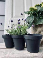 - Mål : L 40cm H 12,5cm – Ø i hver potte 13cm