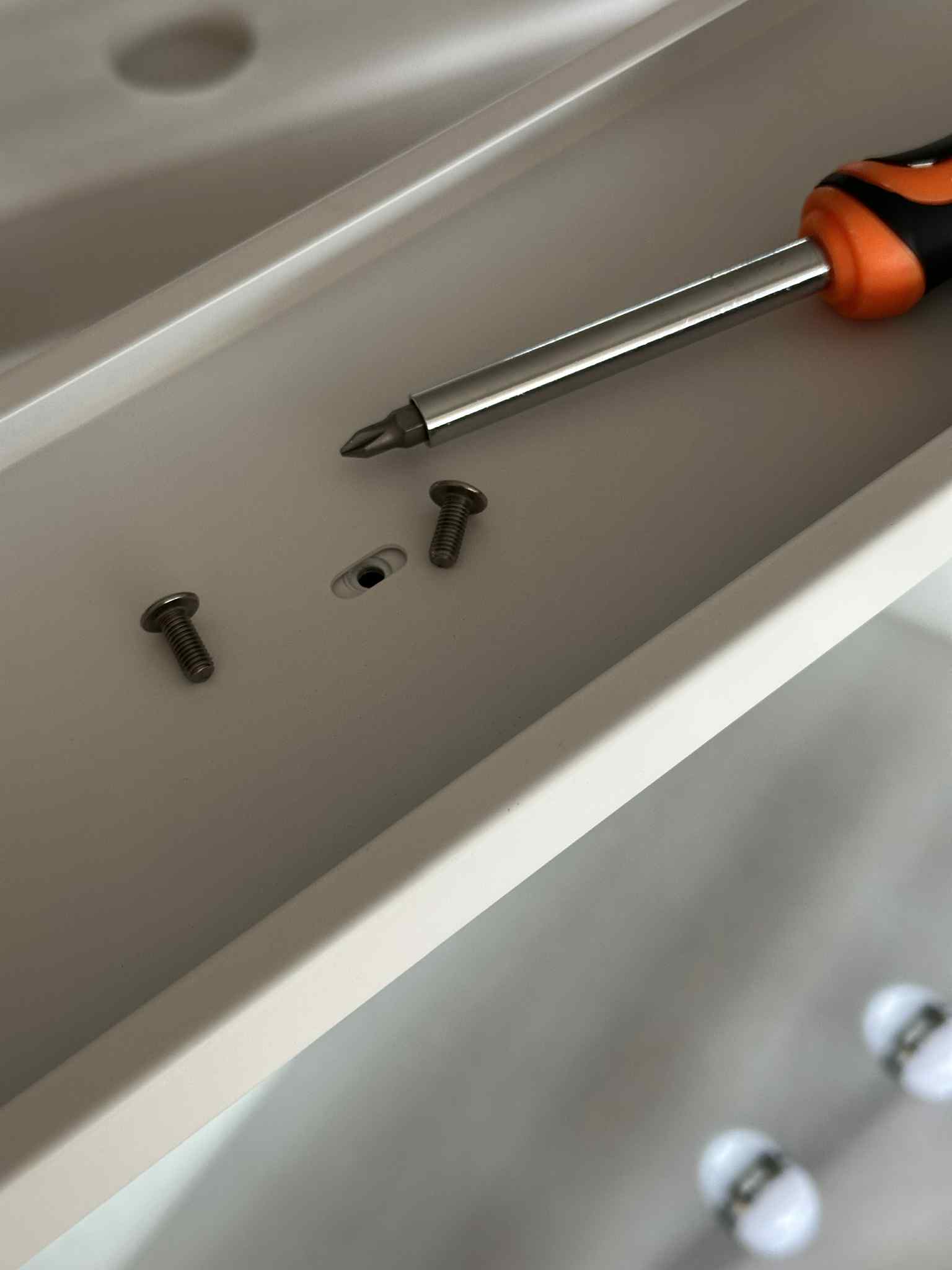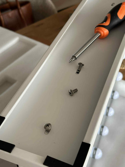 For montering af fod skrues de medfølgende skruer af og påsættes igen efter foden er påsat. Se sidste foto