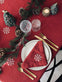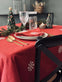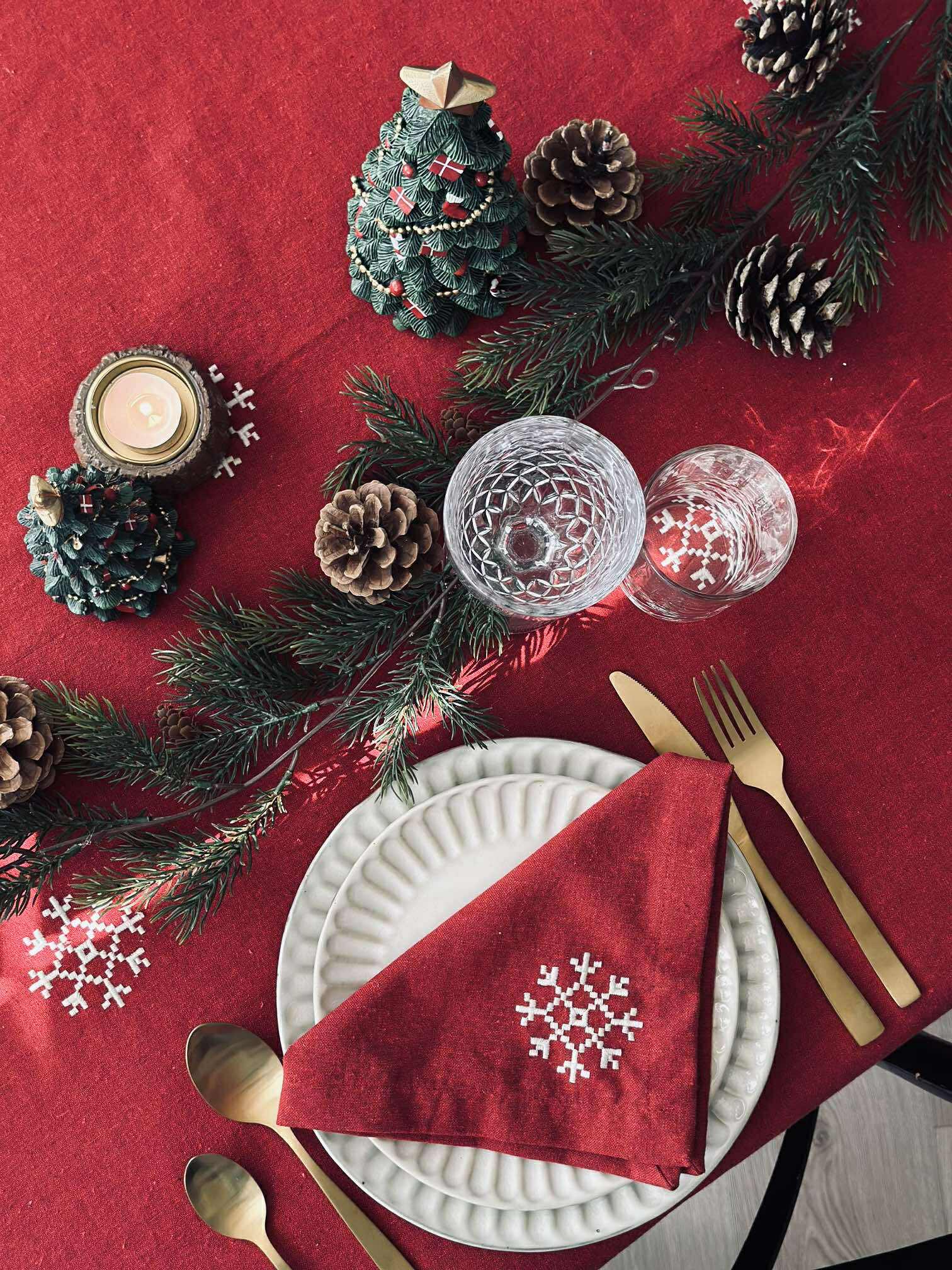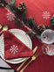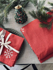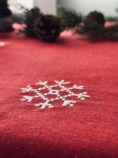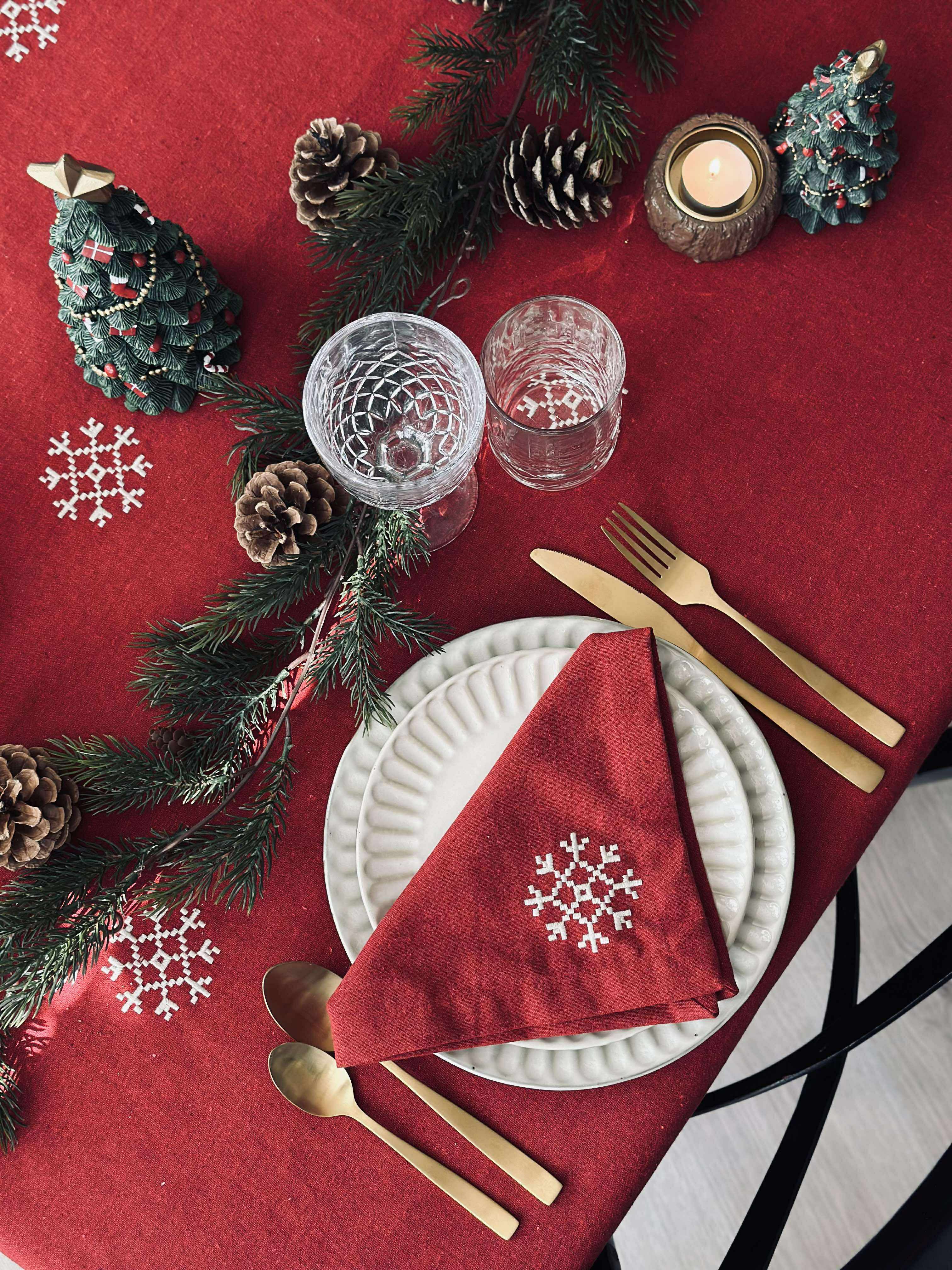 Dæk et indbydende julebord med denne røde juledug JUL. Den julerøde farve giver et varmt udtryk, og dugen har det fineste broderi af snefnug, som tilføjer en rolig og dekorativ detalje.