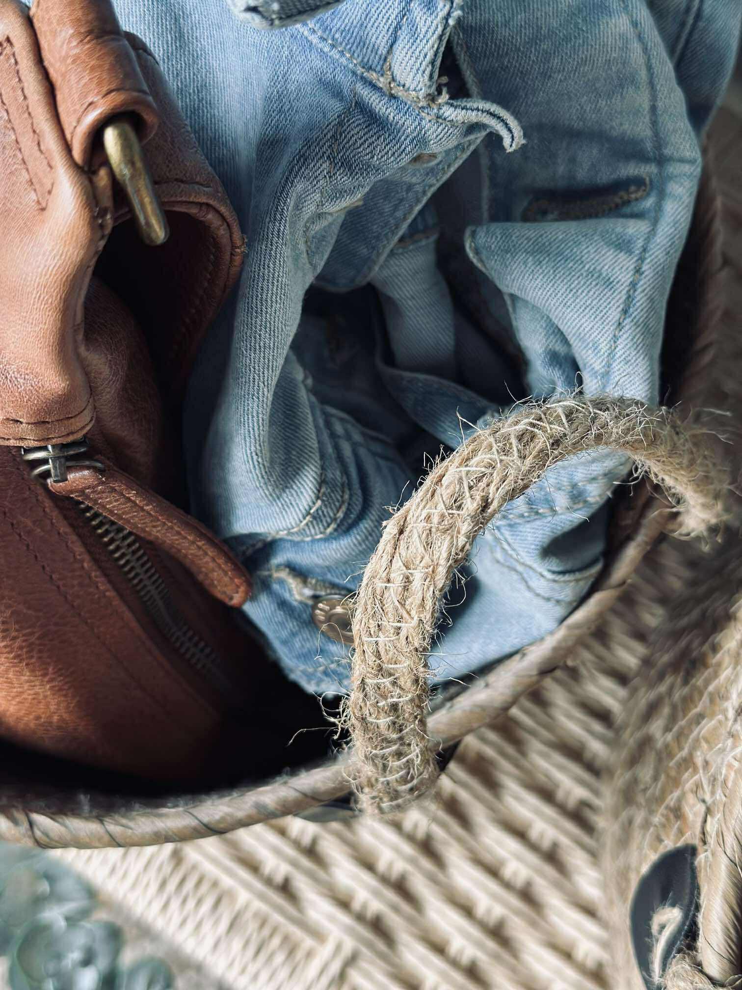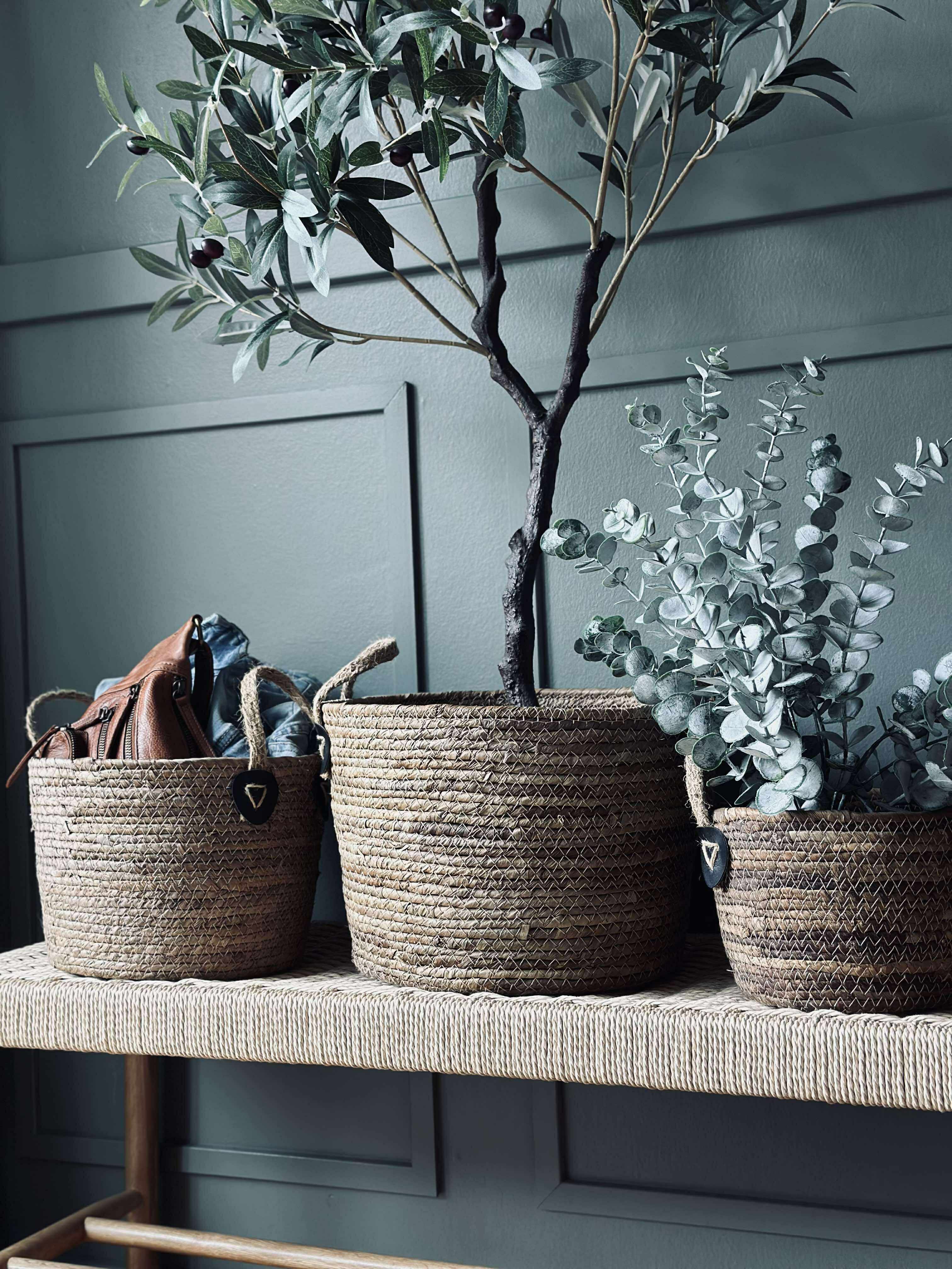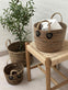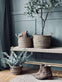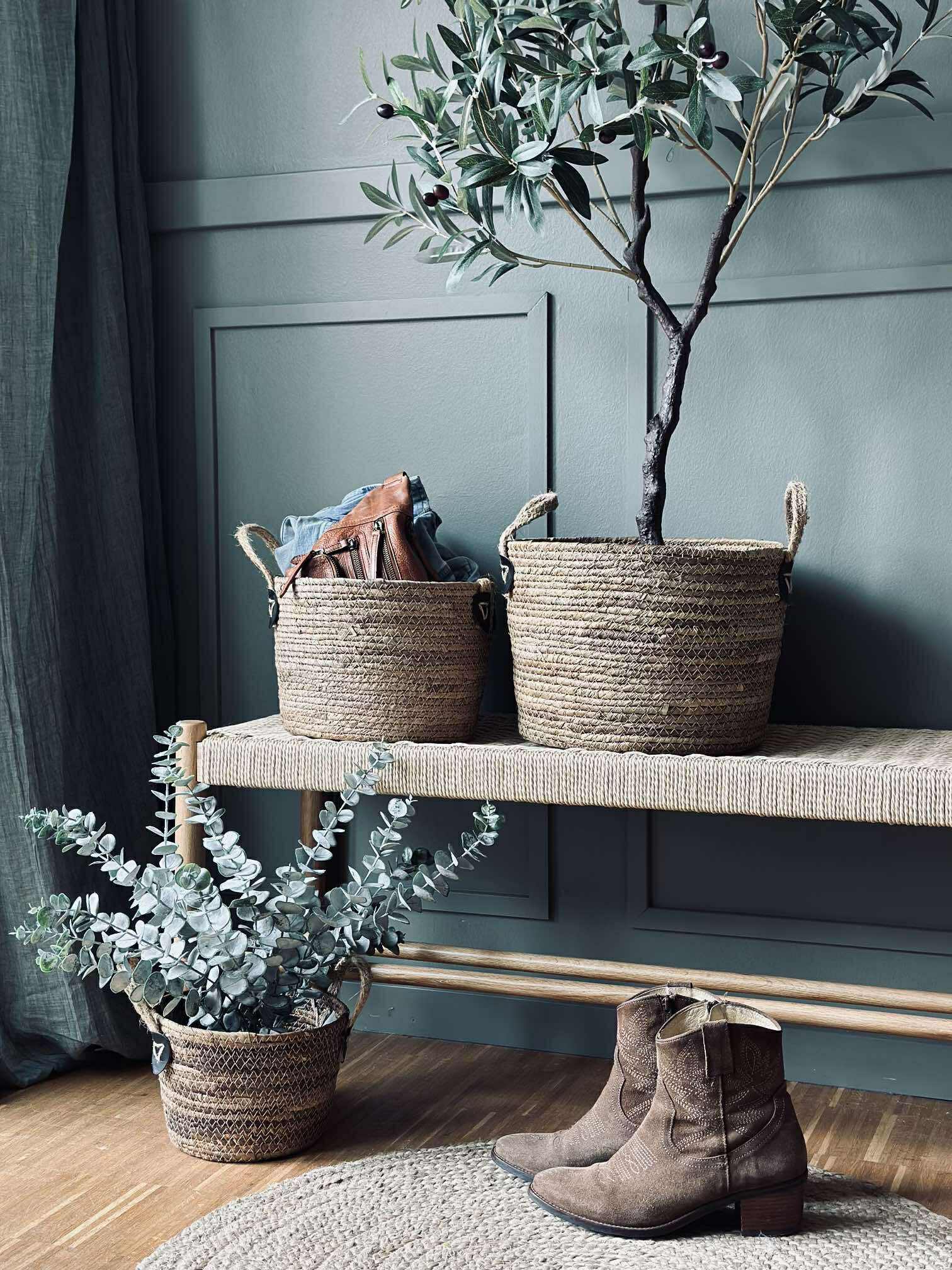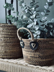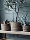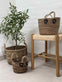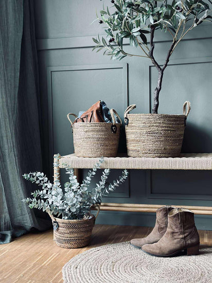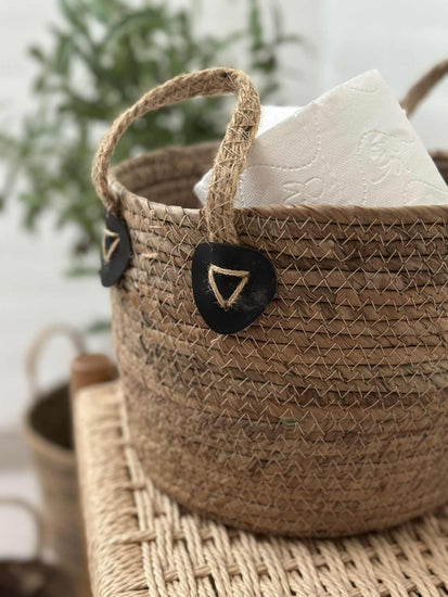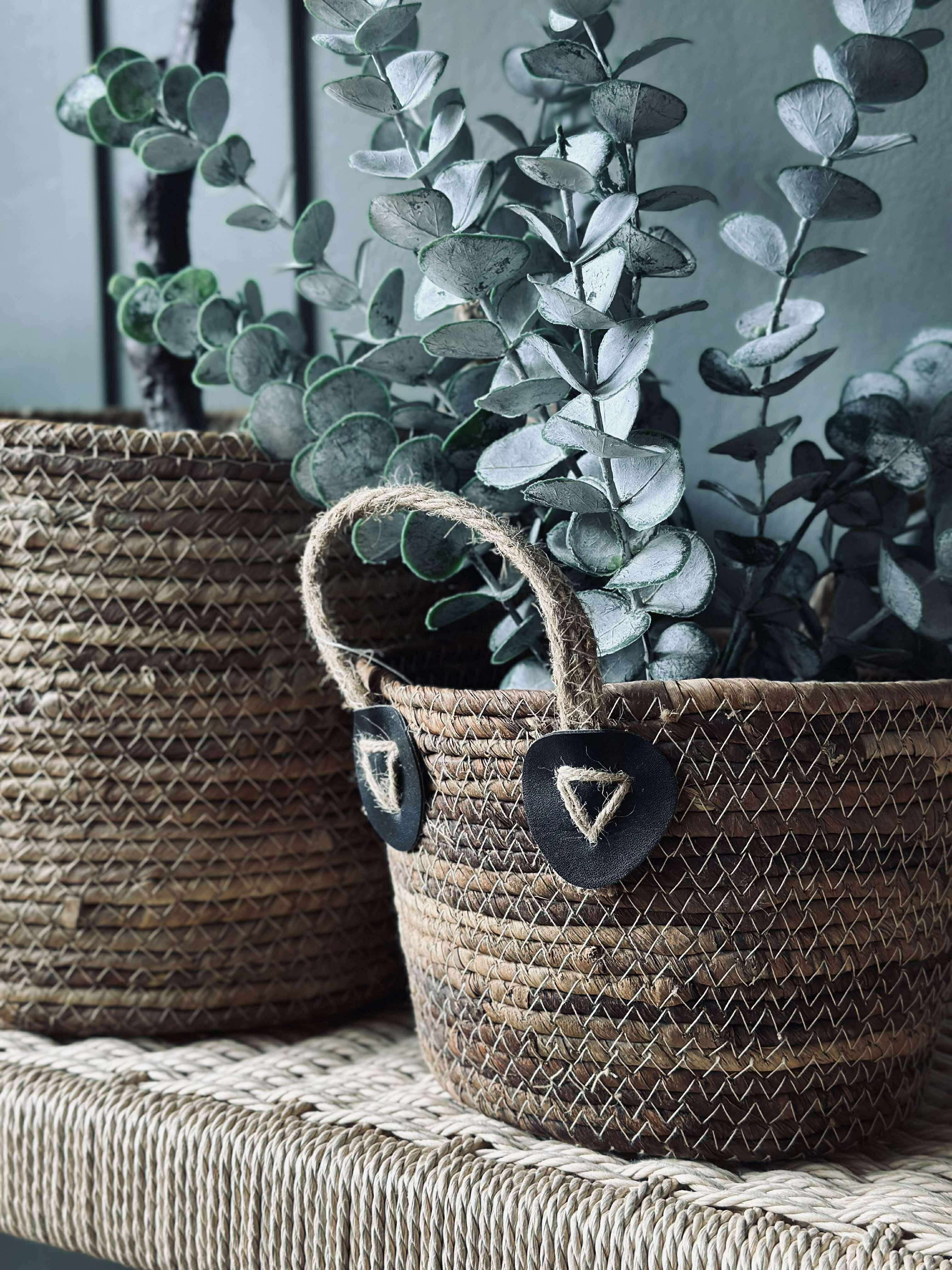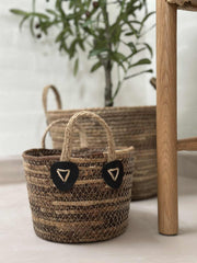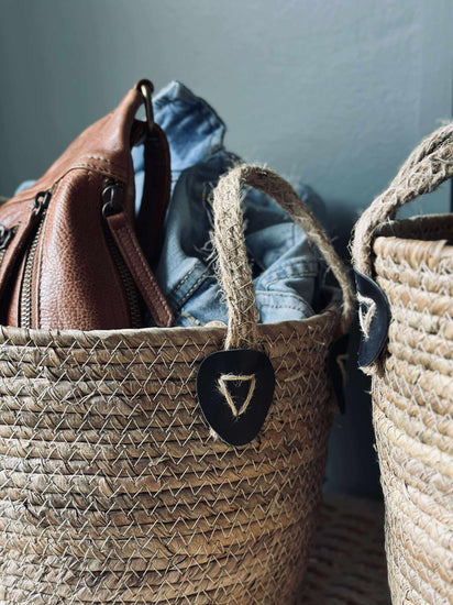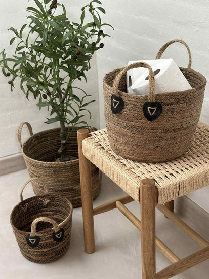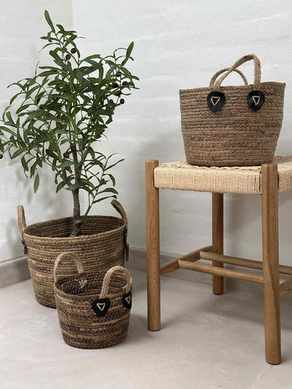 Flotte kurve til opbevaring i bananblade med hanke i jute.