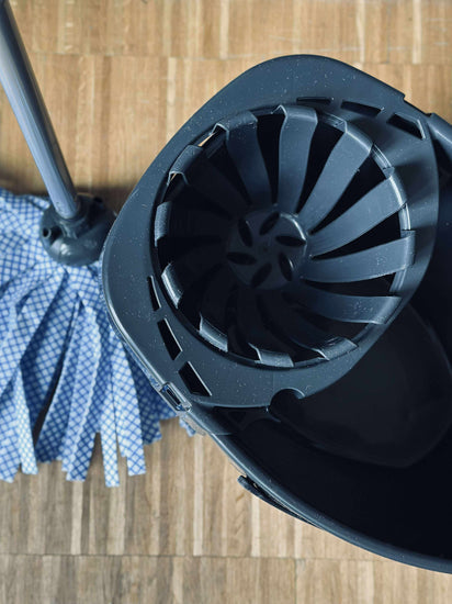 Moppesæt med spand, vrider, moppehoved og 4-delt skaft.