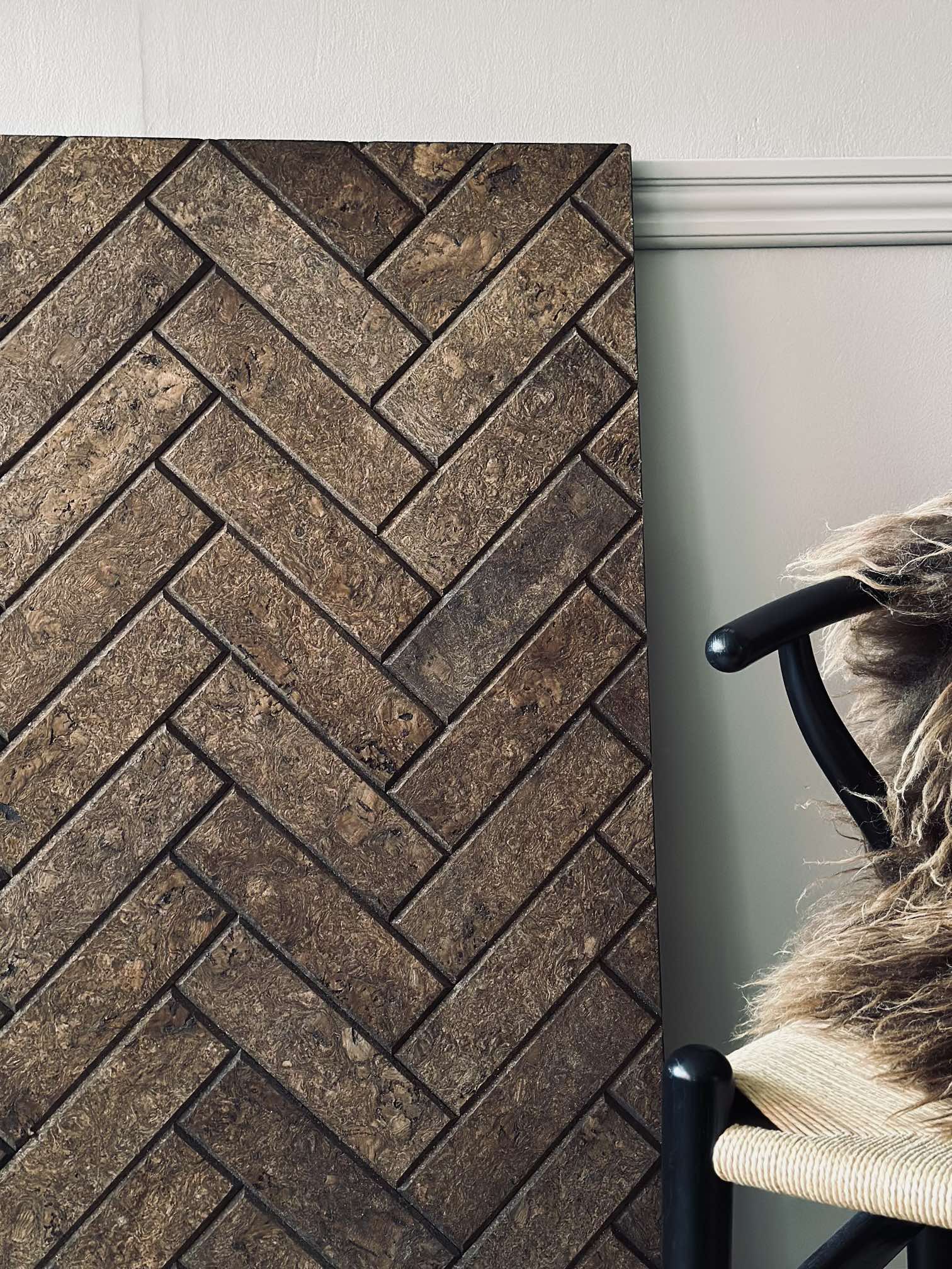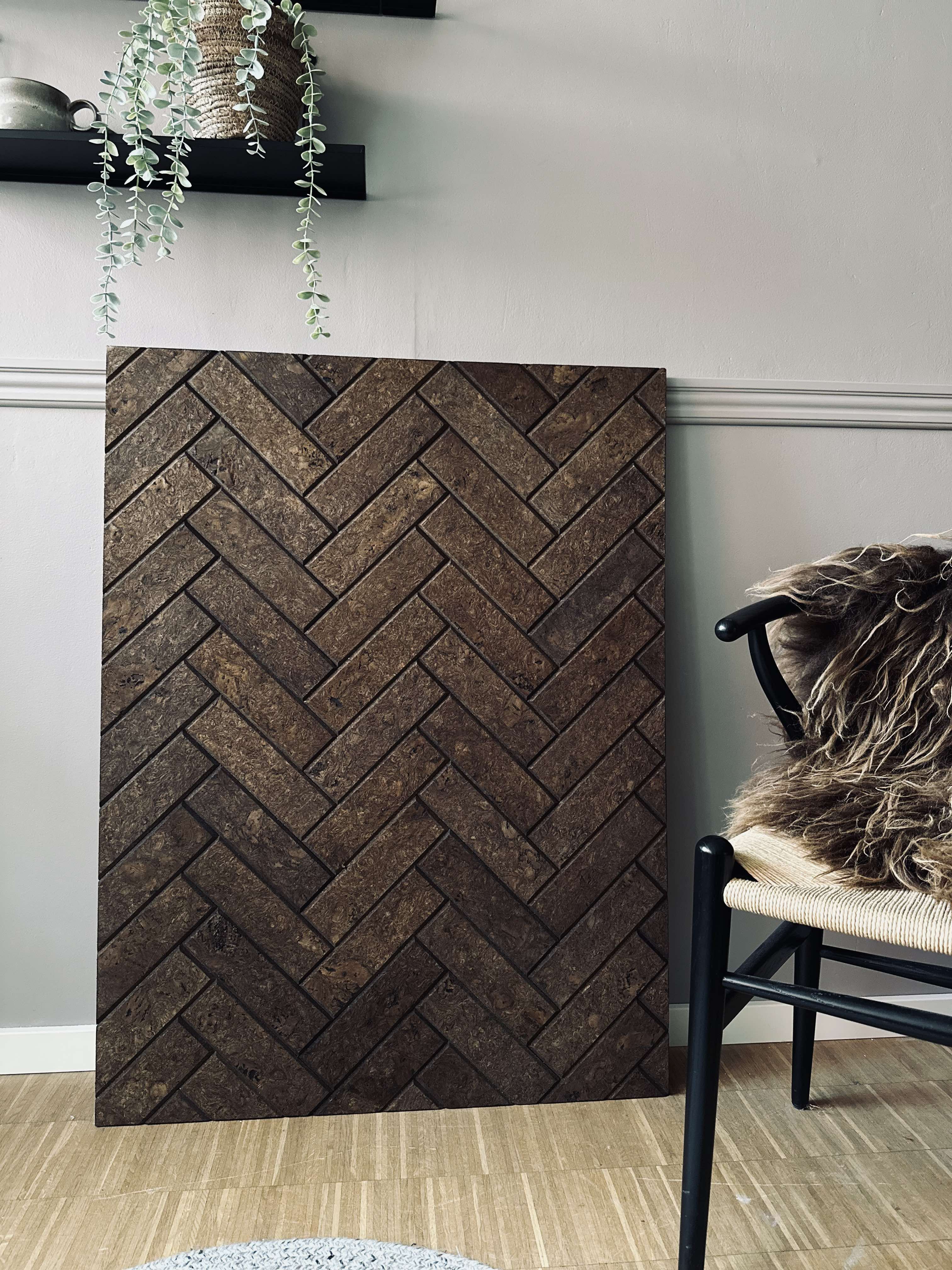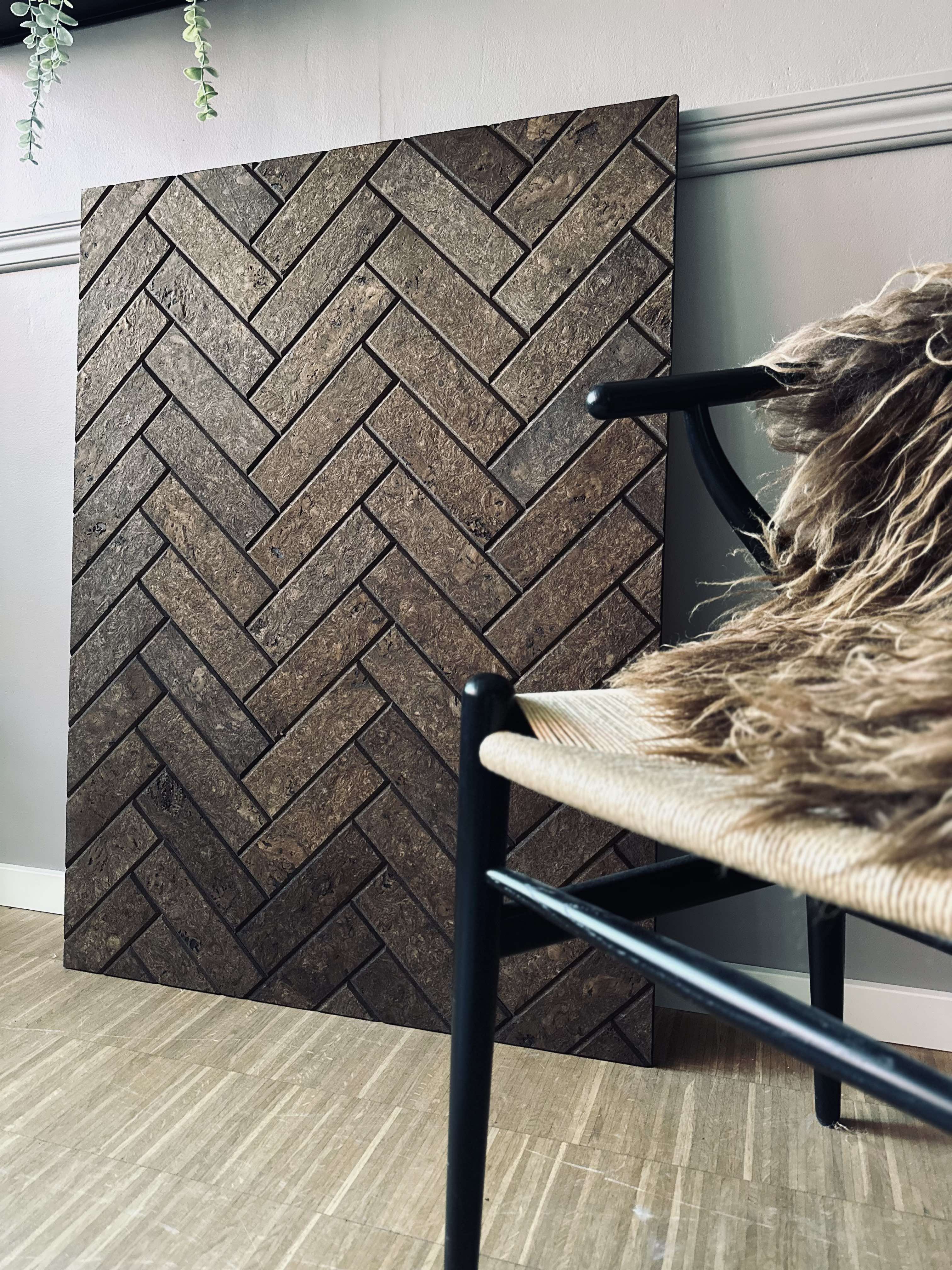 Som inspiration har vi limet 1 kasse kork med mønster : sildeben på en mdf plade, så er den flytbar.