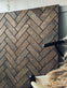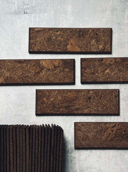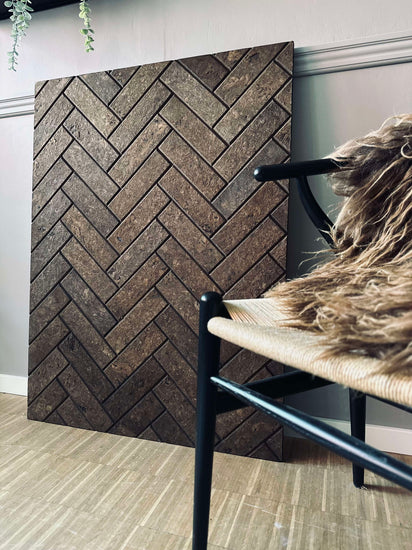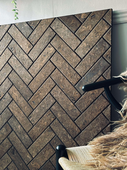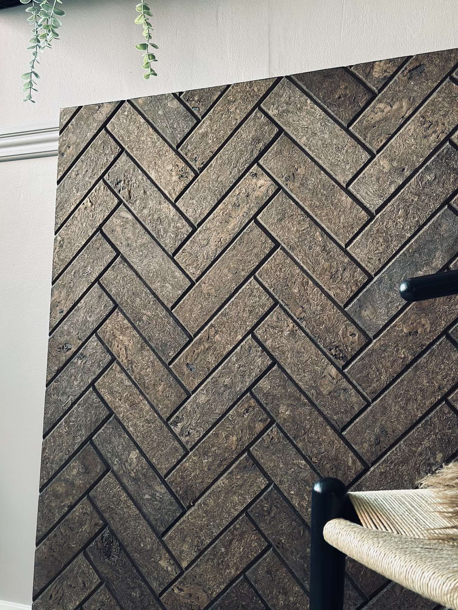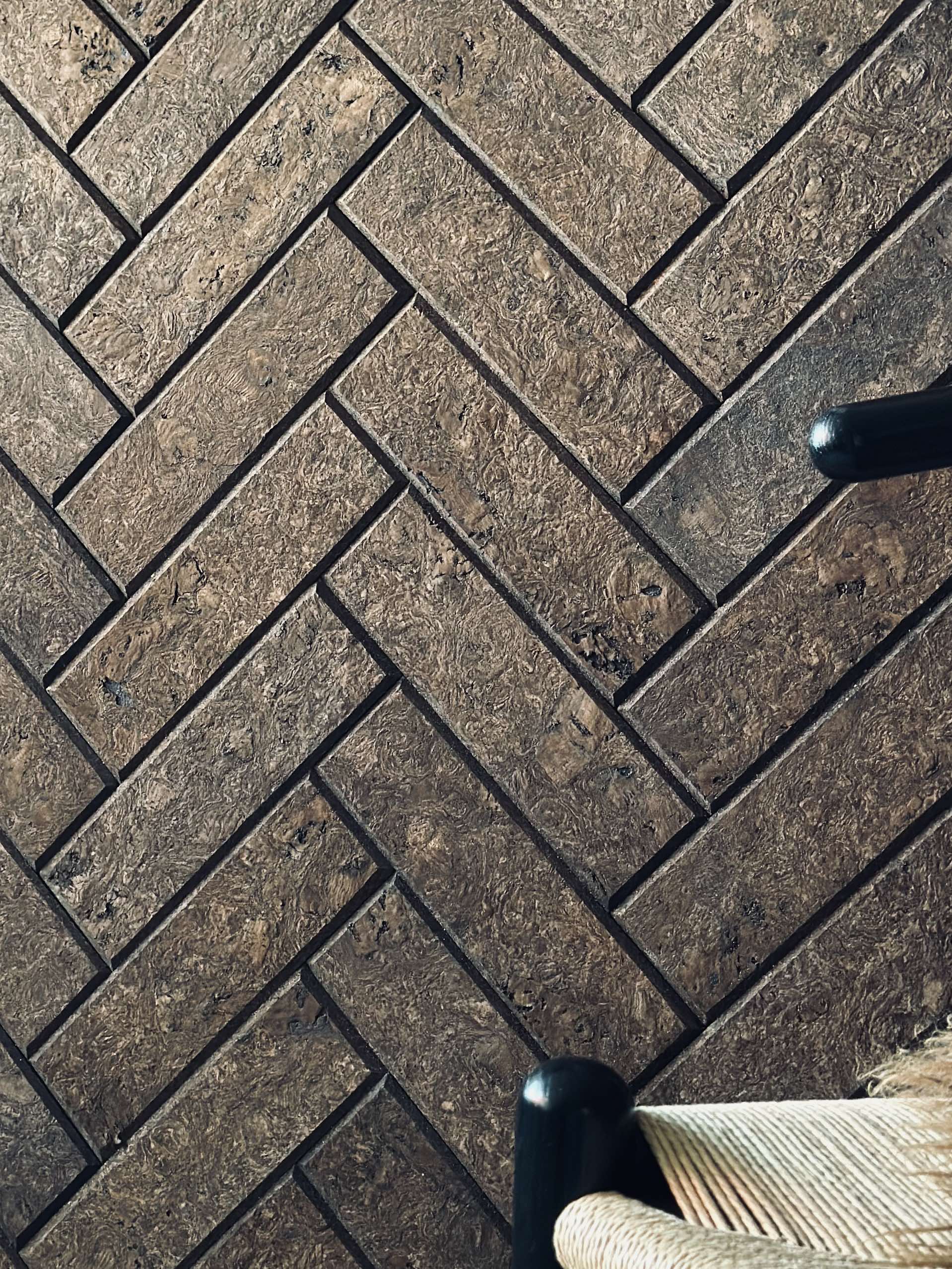 Som inspiration har vi limet 1 kasse kork med mønster : sildeben på en mdf plade, så er den flytbar.