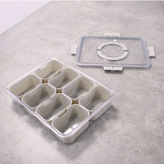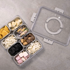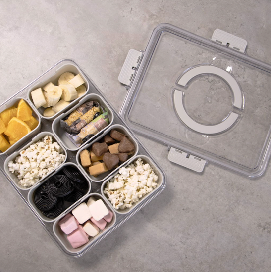 Denne smarte opbevaringsboks har 8 separate rum til nem organisering af mad og snacks - lige til at tage med på farten.