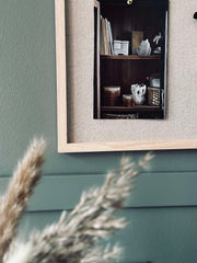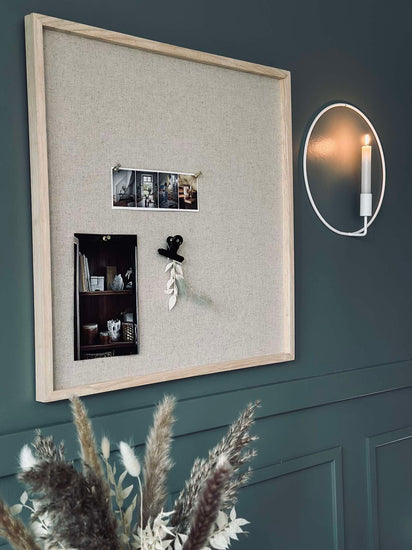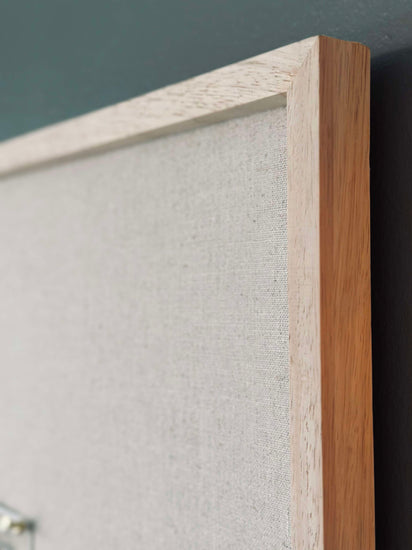 Moderne og stilfuld opslagstavle med træramme i lyst gummitræ. Opslagstavlen er fremstillet af kork og beklædt med naturfarvet hør. Tilsammen giver det tavlen et enkelt og minimalistisk udtryk, der passer ind i ethvert hjem. Brug hør opslagstavlen som en praktisk løsning til opbevaring af noter og huskesedler, eller skab en personlig gallerivæg med billeder, postkort og kunst. Perfekt til entréen, stuen, køkkenet eller hobbyrummet!