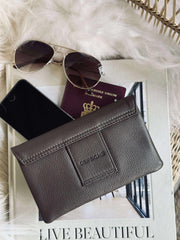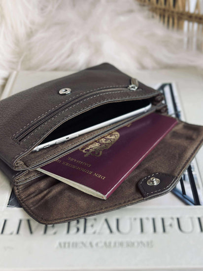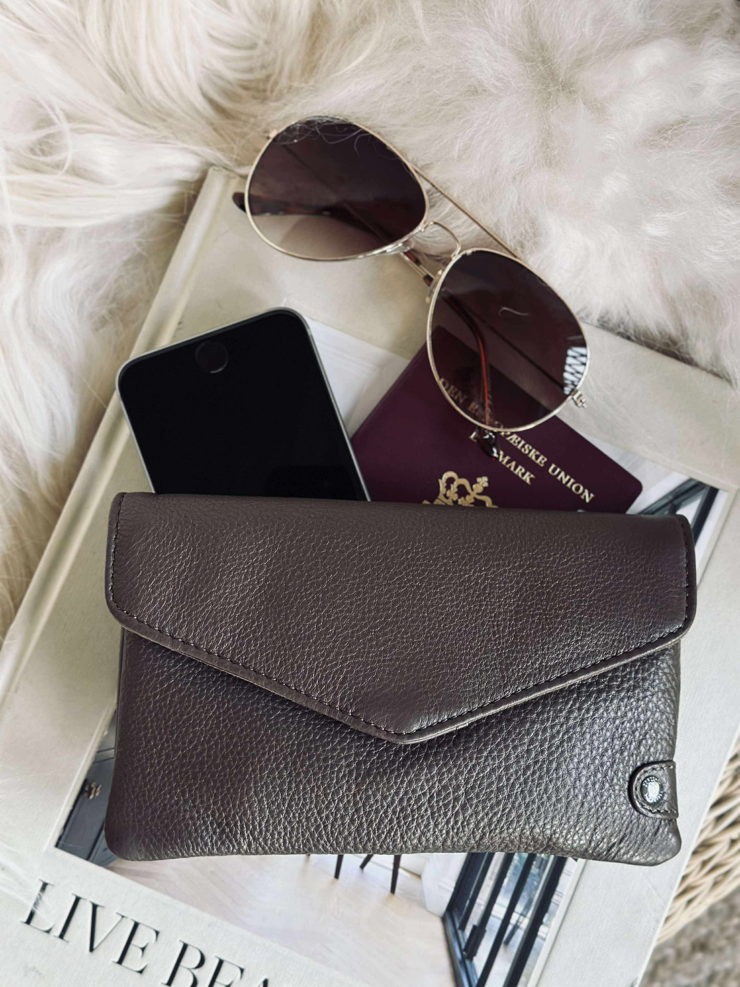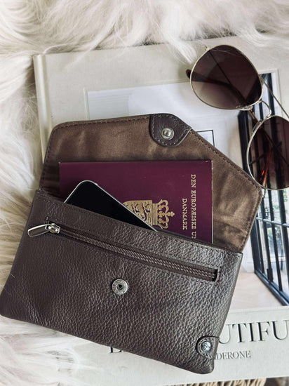 Indeni: Pungen er opdelt i tre sektioner, med plads til kreditkort og andre relevante genstande. Derudover har pungen en lynlåslomme.