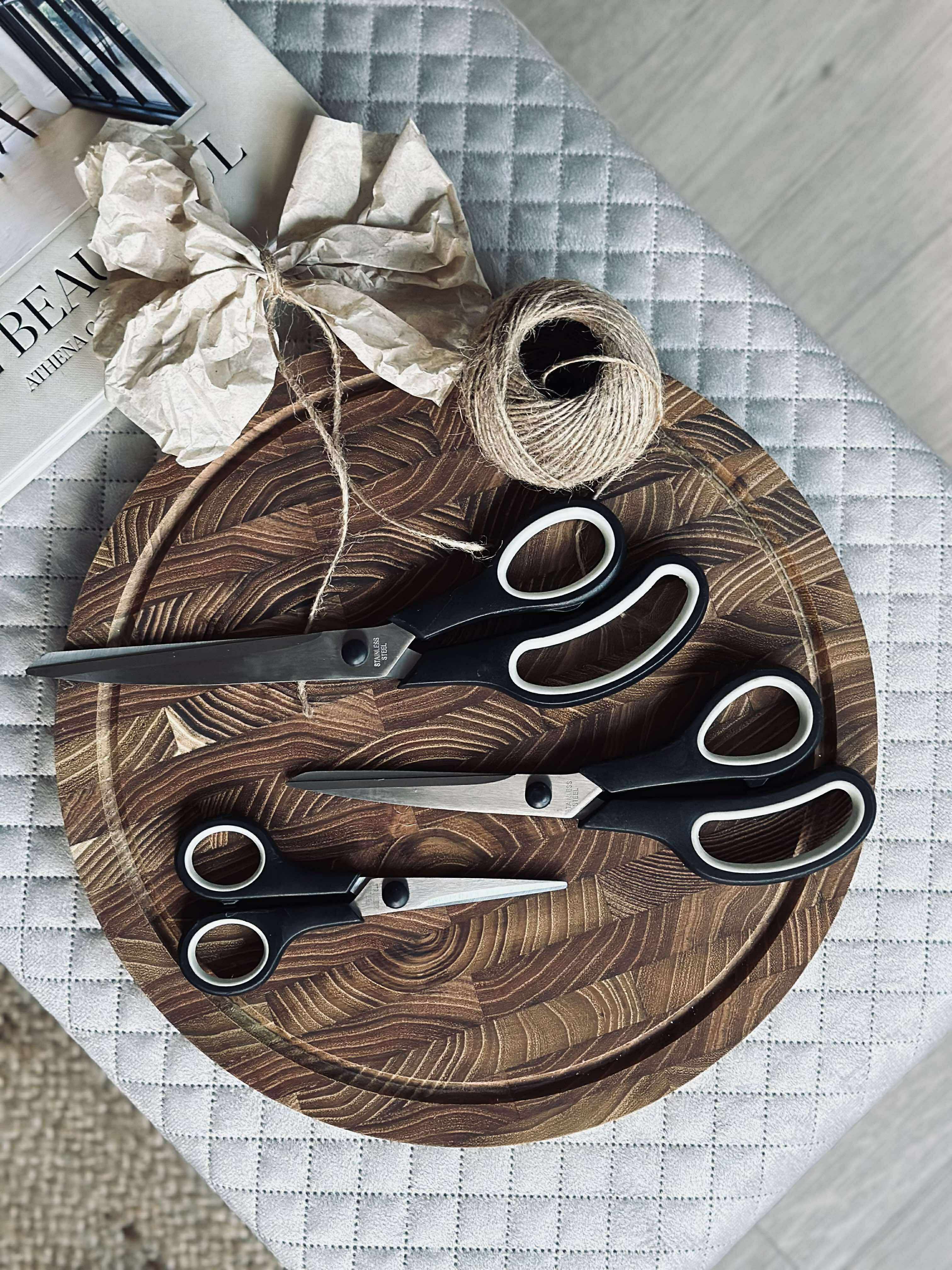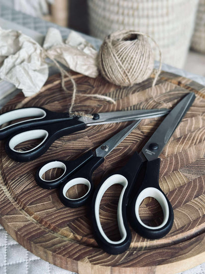Sæt med 3 sakse, bestående af en køkkensaks, en universalsaks og en papirsaks.