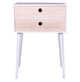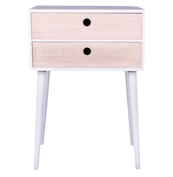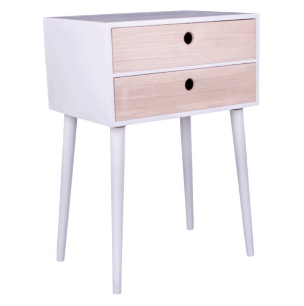Sengebord / kommode i hvid med 2 skuffer i naturtræ.