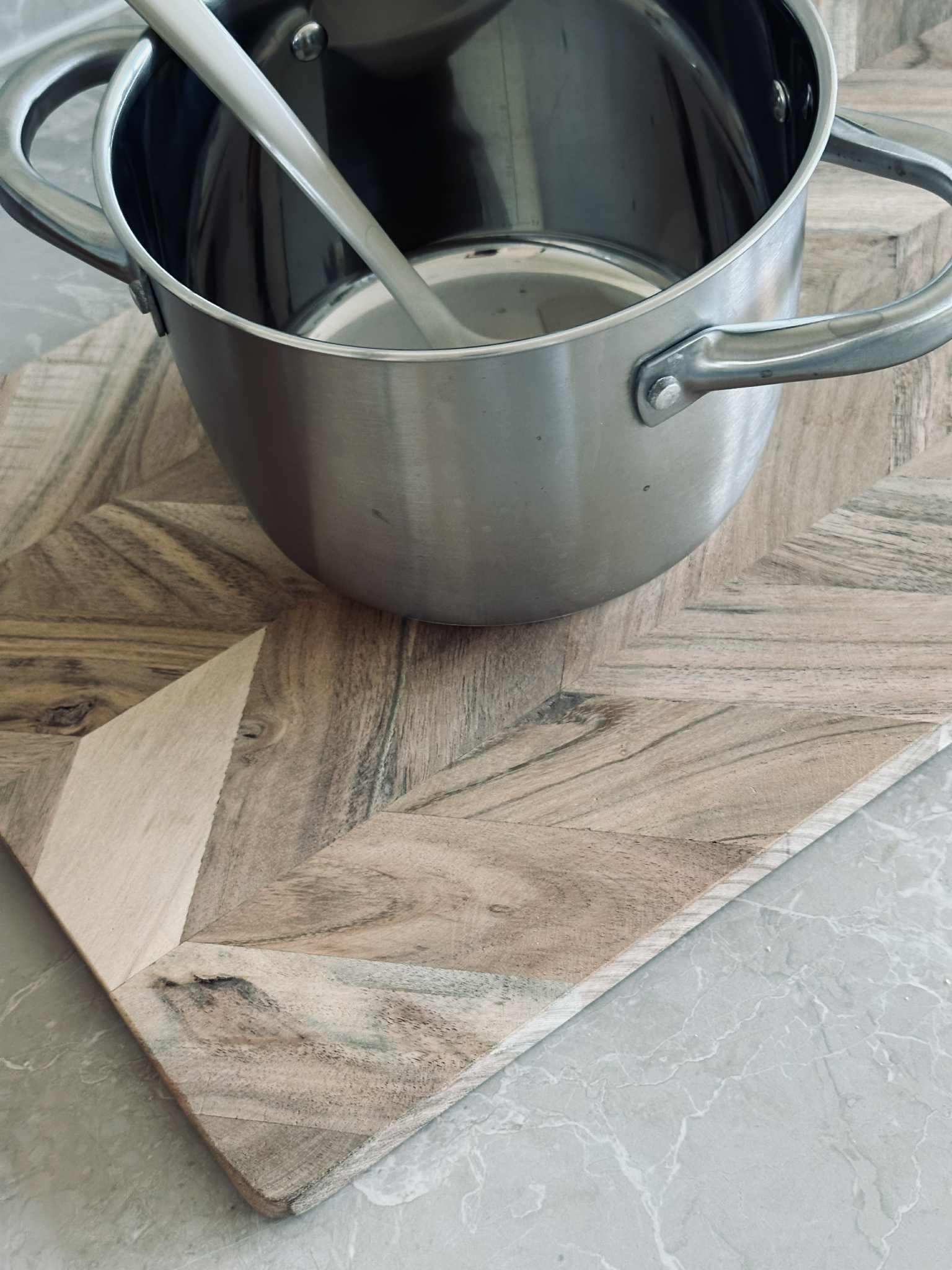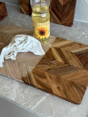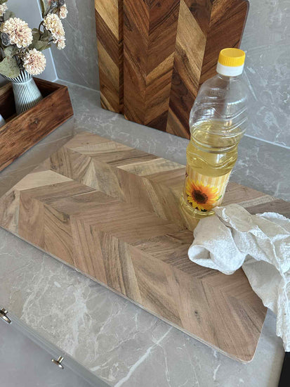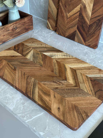 Skærebrættet er lavet af akacietræ, hvilket giver det en robust og slidstærk kvalitet. Akacietræ er naturligt modstandsdygtigt over for fugt, hvilket gør det ideelt til brug i køkkenet, hvor det kan modstå daglig brug uden at miste sin form eller funktion. Den varme tone og den glatte overflade tilføjer desuden et æstetisk element til køkkenindretningen.