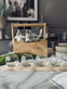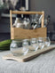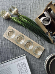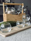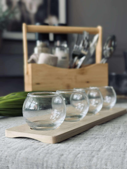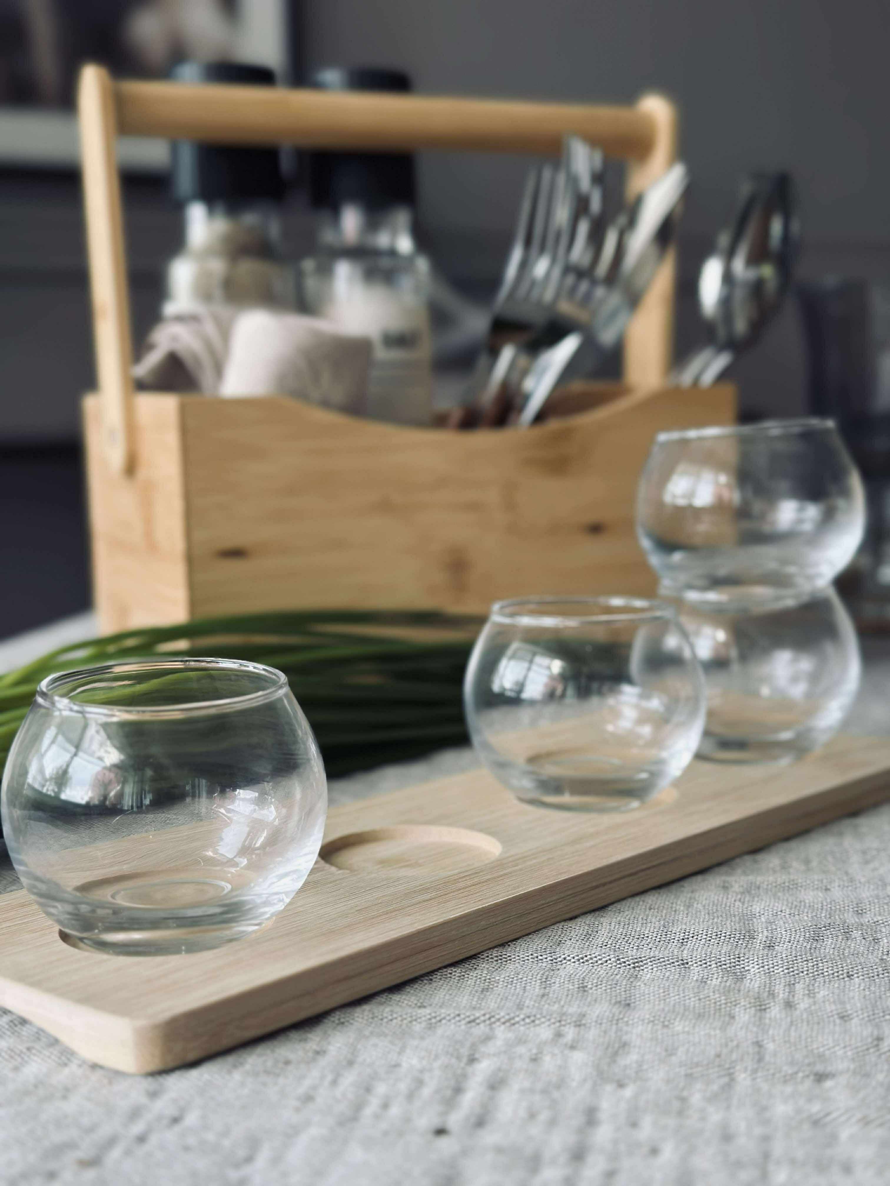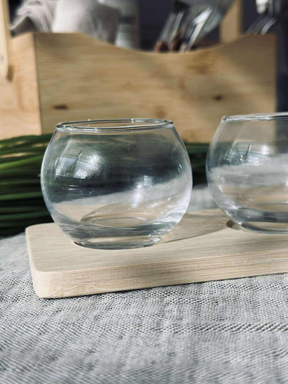 Sættet består af 4 skåle i glas samt et serveringsfad i bambus.
