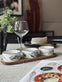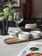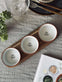 Sættet består af 3 skåle i glas samt et serveringsfad i bambus.