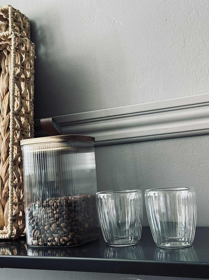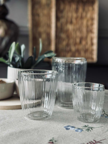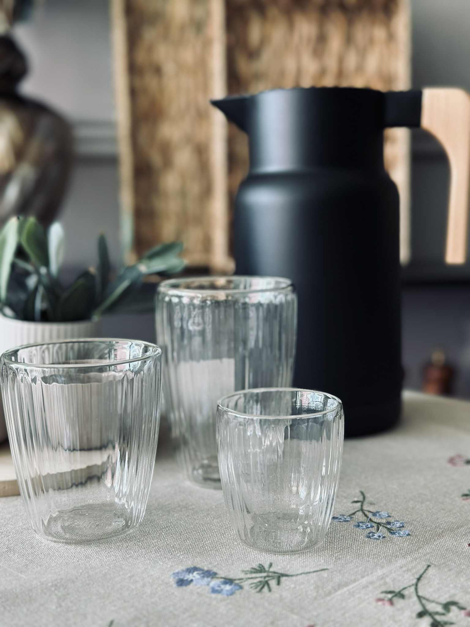 Pakken indeholder : 2 stk. dobbeltvæggede glas (125 ml) med elegant rillet design