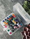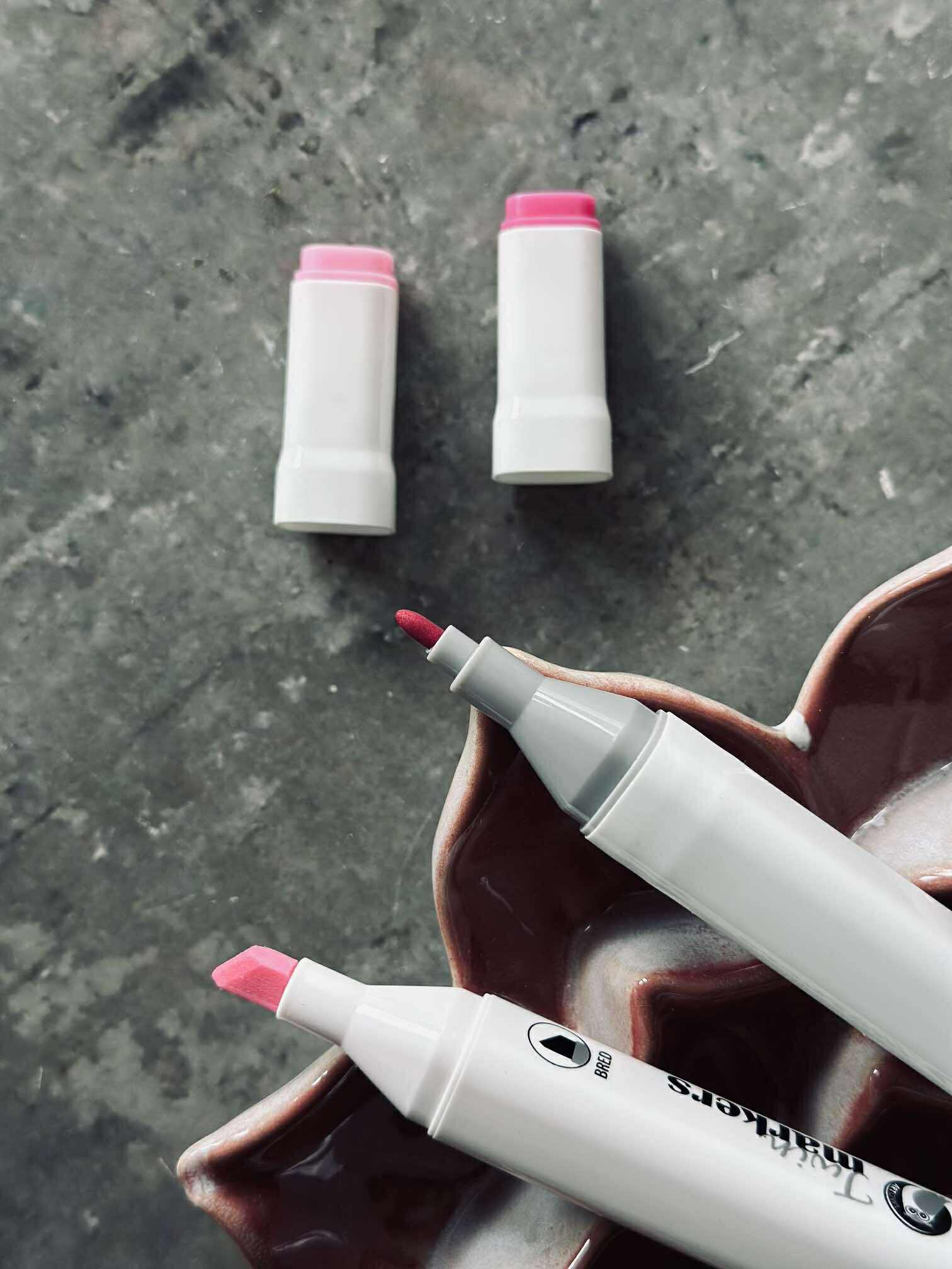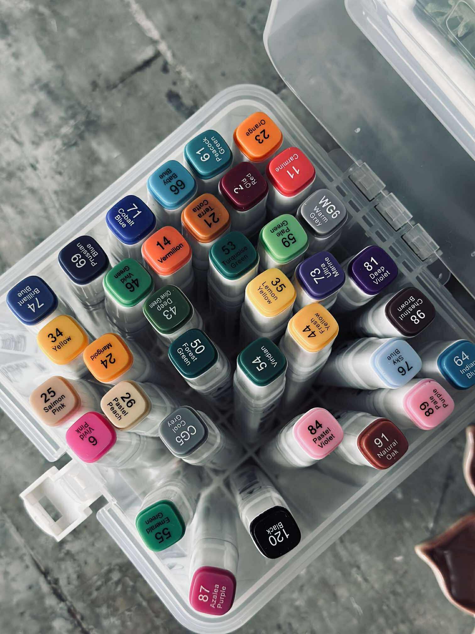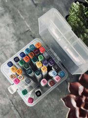 Tuscher i en bred farvepalet. Den ene ende har en bred, skrå spids beregnet til farvelægning af større områder og brede strøg. Den anden ende har en fin spids, beregnet til lette penselstrøg. Praktisk opbevaringsæske med hank, gør både opbevaring og transport nemmere.